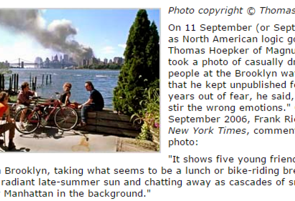 Il fotografo Thomas Hoepker ha catturato quest’immagine con la sua macchina fotografica l’11 settembre 2001, mentre si dirigeva in macchina dall’Upper East Side di Manhattan verso la zona della tragedia.