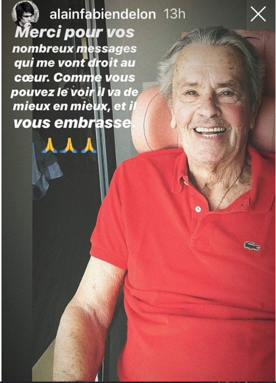 Il figlio del celebre attore, Alain Fabien Delon, ha infatti postato una story in cui Alain Delon appare in buone condizioni e ringrazia i fan del loro affetto: «Grazie per i vostri numerosi messaggi,che sono andati dritti al mio cuore. Come potete vedere, miglioro di giorno in giorno e vi abbraccio».