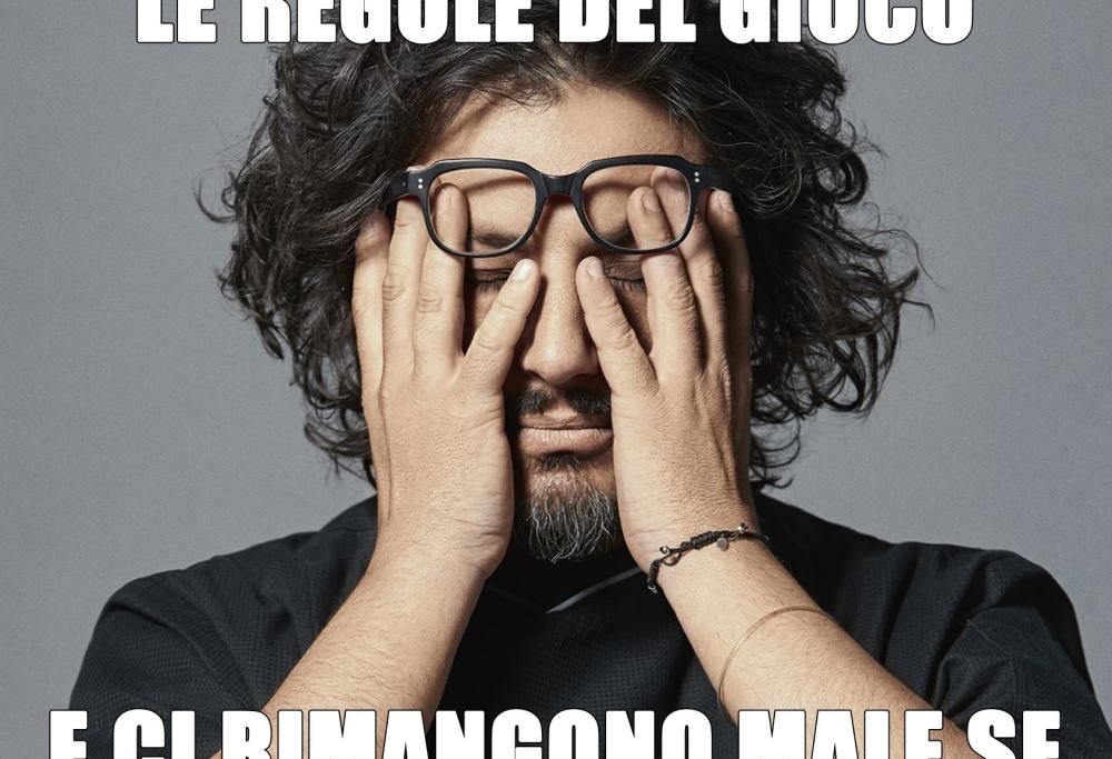 Lo chef e conduttore televisivo infatti ha pubblicato una sua foto con le mani che coprono il viso e la scritta: «Quando spieghi le regole del gioco… e ci rimangono male se non vincono!», per smorzare il polverone provocato dalle lamentele di un concorrente dello show.