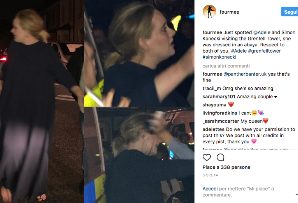 L’incendio della Grenfell Tower di Londra ha mobilitato tanti cittadini, corsi a prestare aiuto ai feriti. E tra loro c’era anche Adele, che si è unita ai soccorritori cercando di incoraggiare i superstiti. I presenti hanno molto apprezzato la presenza dell’artista e il suo aiuto, e le hanno scattato numerose foto, che hanno poi twittato in Rete.