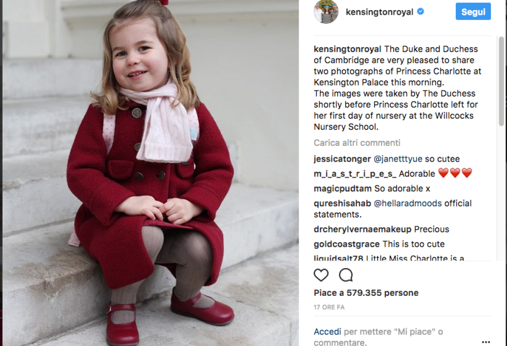 La piccola Charlotte, due anni, figlia del Principe William e di Kate Middleton, ha affrontato il primo giorno d’asilo. Charlotte è stata iscritta alla Willcocks Nursery School, asilo poco distante da Kensington Palace, dove la bimba vive con la famiglia. Per il fratellino George, invece, era stato scelta la Westacre Montessori School, nel Norfolk.