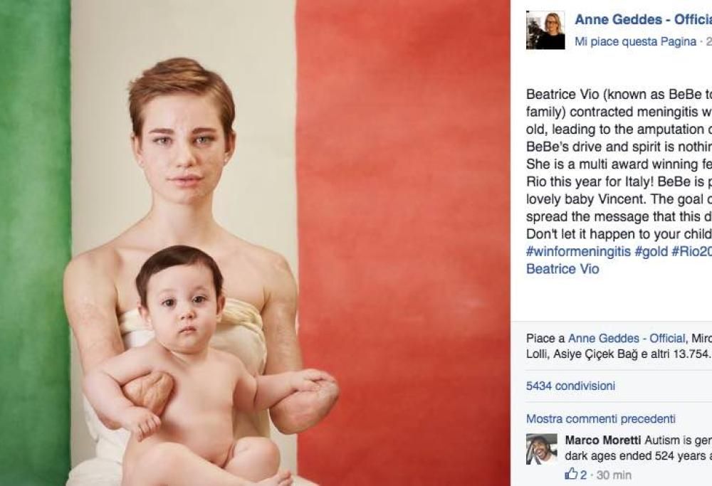 Ma Bebe si è conquistata l’attenzione del mondo intero anche perché è testimonial di una campagna di forte impatto contro la meningite. E’ infatti ritratta in foto senza le sue abituali protesi, con tutti i segni della terribile meningite che la colpì a undici anni e che le causò la perdita di tutti gli arti. In braccio Bebe tiene un bambino, come tutti gli altri atleti paralimpici protagonisti della campagna firmata dalla celebre fotografa Anne Geddes. Tanti campioni, tante storie di dolore e di riscatto, e un invito pressante: vaccinate i vostri bambini. Perché malattie come la meningite possono essere prevenute, grazie solo al vaccino. Un messaggio forte e coraggioso, ripetuto da tutti i protagonisti della campagna.