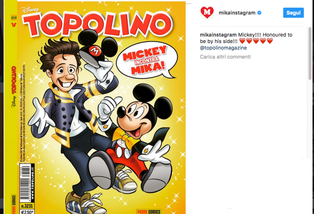 Anche Topolino rende omaggio a Mika: il settimanale ha infatti deciso di dedicare la copertina dell’ultima settimana di ottobre proprio all’artista, con tanto di titolo “Mickey incontra Mika!”.