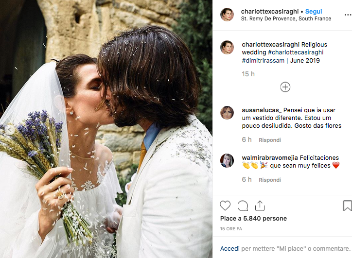 Guarda le bellissime foto del matrimonio religioso di Charlotte Casiraghi e Dimitri Rassam: romantico abito bianco, bouquet di spighe e lavanda e bacio appassionato tra gli sposi