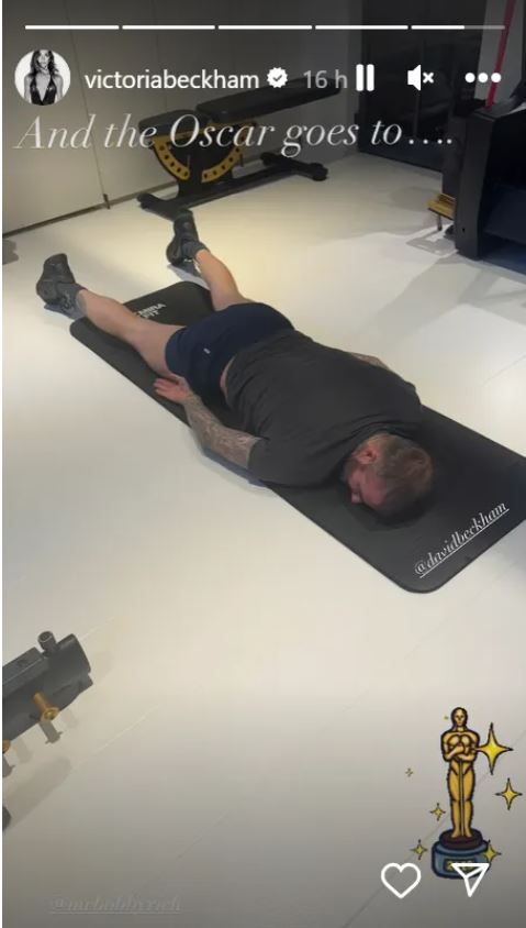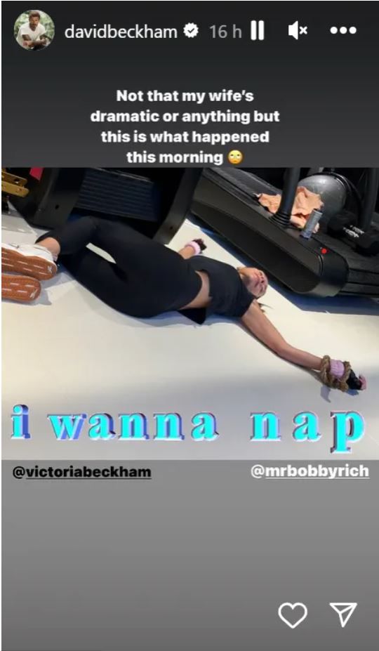 David ne approfitta per pubblicare una story su Instagram, prendendo in giro la moglie. Scatta una foto di Victoria al tappeto e scrive come didascalia: “Non che mia moglie sia drammatica o qualcosa del genere, ma questo è quello che è successo stamattina… Voglio fare un pisolino”.