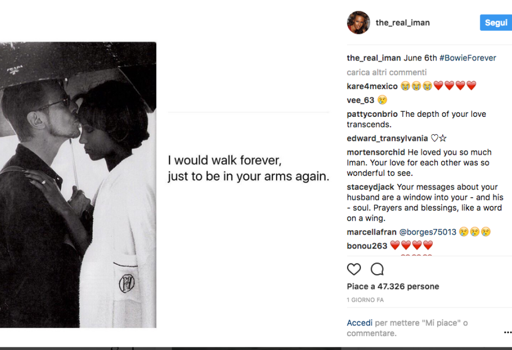 Iman ha deciso di ricordare il marito David Bowie nel giorno del loro anniversario di matrimonio, pubblicando su Instagram una commovente foto del giorno delle loro nozze. La coppia si era sposata il 24 aprile 1992, ma aveva celebrato il matrimonio il 6 giugno. La foto è molto intensa e romantica, e Iman l’ha accompagnata con questa frase: «Camminerei per sempre, solo per essere ancora tra le tue braccia».