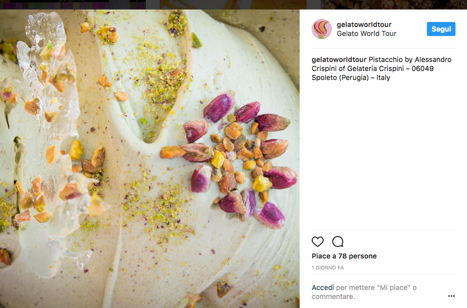 Al sapore di pistacchio. è stato creato in Umbria e ha vinto il primo premio al prestigioso Gelato World Tour