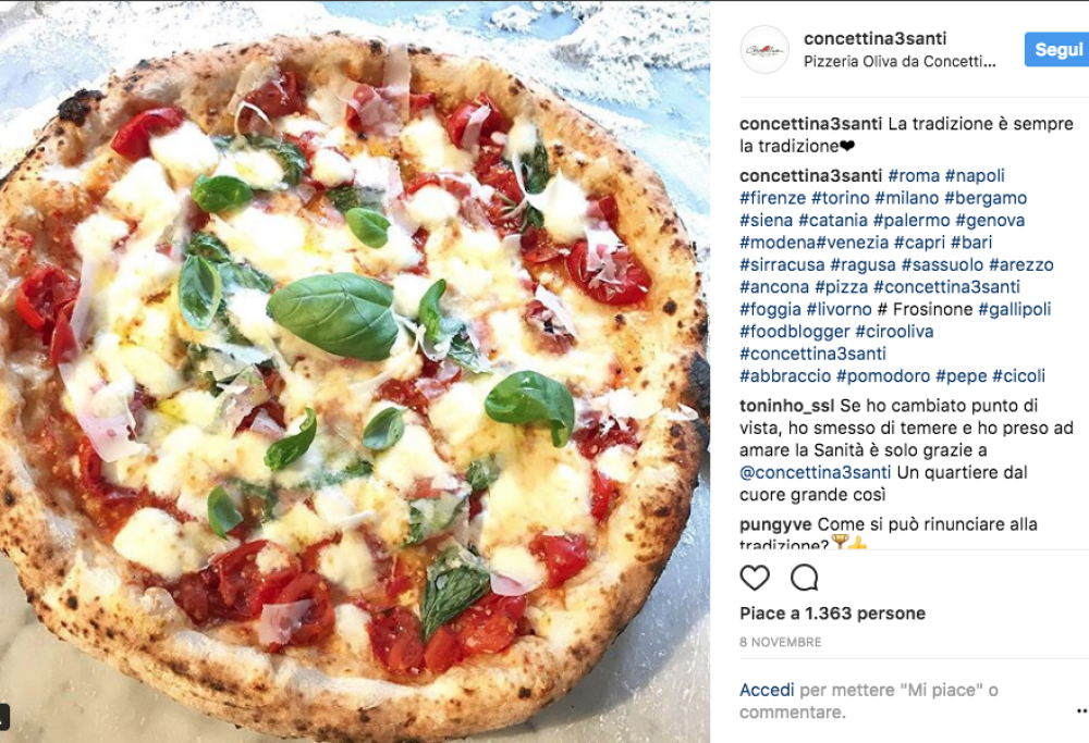Pizza ottenuta da farine di agricoltura biologica, con continua ricerca delle migliori eccellenze gastronomiche italiane da proporre per condirla.
