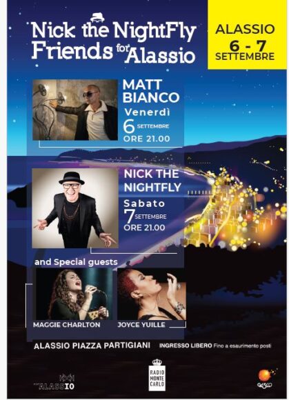 Sabato 7 settembre altro grande appuntamento con il concerto di Nick the Nightfly. Ha vinto un Telegatto come migliore voce della notte e le Cuffie d’Oro per il miglior programma notturno della radiofonia italiana. Nick è anche un affermato cantante, suona la chitarra e compone brani di grande valore artistico, come quello scritto per Andrea Bocelli, Semplicemente, con testo di Maurizio Costanzo. Dal 2003 Nick è direttore artistico del Blue Note Milano (di cui Radio Monte Carlo è partner radiofonico), il tempio milanese del jazz, punto di riferimento della musica di qualità. Ad Alassio porterà ospiti speciali come Maggie Charlton, reduce dal successo del disco di Burt Bacharach. Maggie Charlton é figlia d’arte e si è specializzata in canto jazz alla Civica di Milano. Ha come modello le grandi cantanti afroamericane quali Ella Fitzgerald e Sarah Vaughan e propone un repertorio di celebri classici del jazz. Nonostante la giovane età, classe 1997, ha già al suo attivo diversi importanti palcoscenici come il Blue Note, le rassegne di Vigevano, Villa Simonetta e Garbagnate collaborando con Sarah Jane Morris, Karima, Vanessa Haynes, Tony Momrelle. Con lei arriverà in Piazza Partigiani anche Joyce Yuille, cantante italo-americana con la sua voce soul, jazz, R&B. La sua vocalità elegante e al tempo stesso potente e passionale è stata apprezzata dai più importanti festival e jazz club del circuito mondiali. Joyce Yuille ha lavorato con Randy Crawford, Ron, Laura Pausini, Elio e Le Storie Tese, Ronan Keating e molti altri ed è stata sullo stesso palco come corista di Renato Zero, Umberto Tozzi, Enrico Ruggeri e I Pooh, ma anche delle Sister Sledge e di Dee Dee Bridgewater.