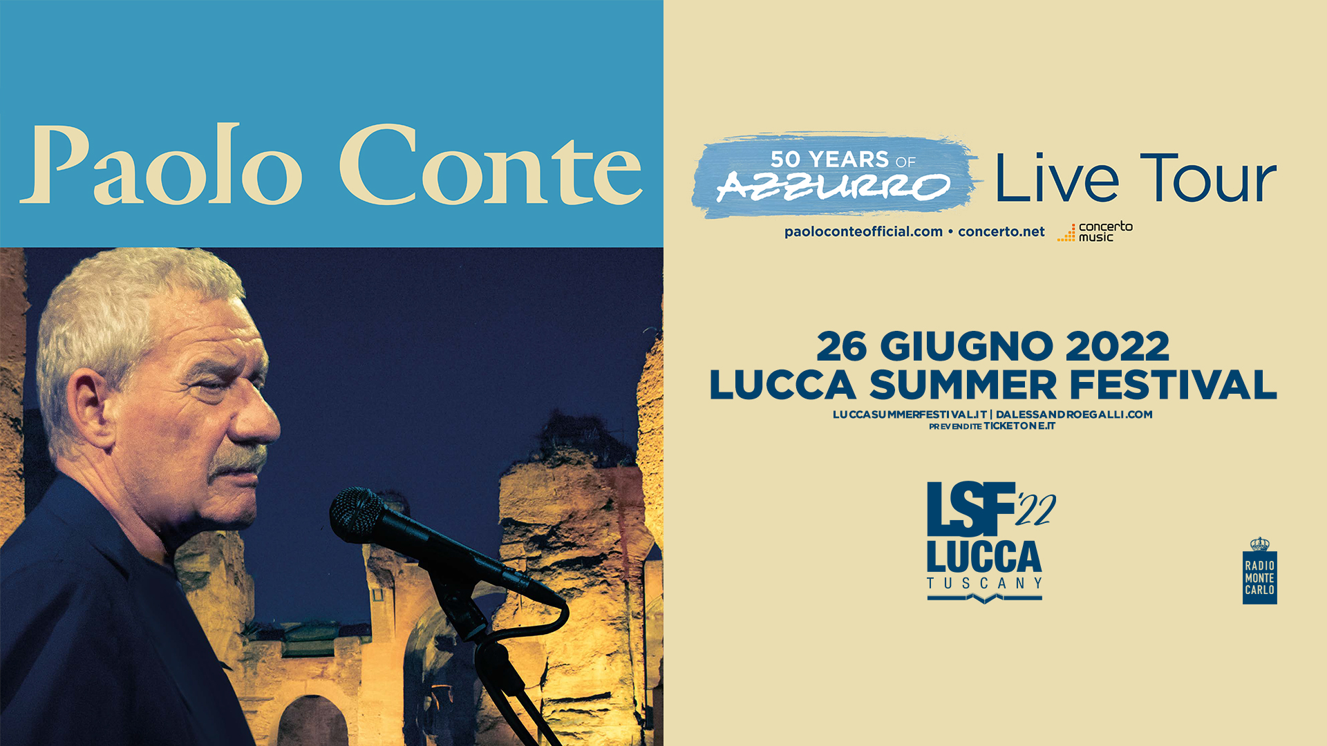 Lucca Summer Festival comunica che il concerto di Paolo Conte, rinviato nel 2020 e 2021, si terrà domenica 26 Giugno 2022. I biglietti già venduti per le date del 2020 e 2021 rimarranno validi e dal 5 agosto sono aperte le vendite di nuovi biglietti per il concerto del 2022. Il cantautore piemontese si esibirà per la prima volta sul palco del Lucca Summer Festival in un concerto che lo vedrà riproporre tutti i brani principali della sua leggendaria carriera. Tutte le informazioni riguardo la vendita dei biglietti sono disponibili su www.dalessandroegalli.com