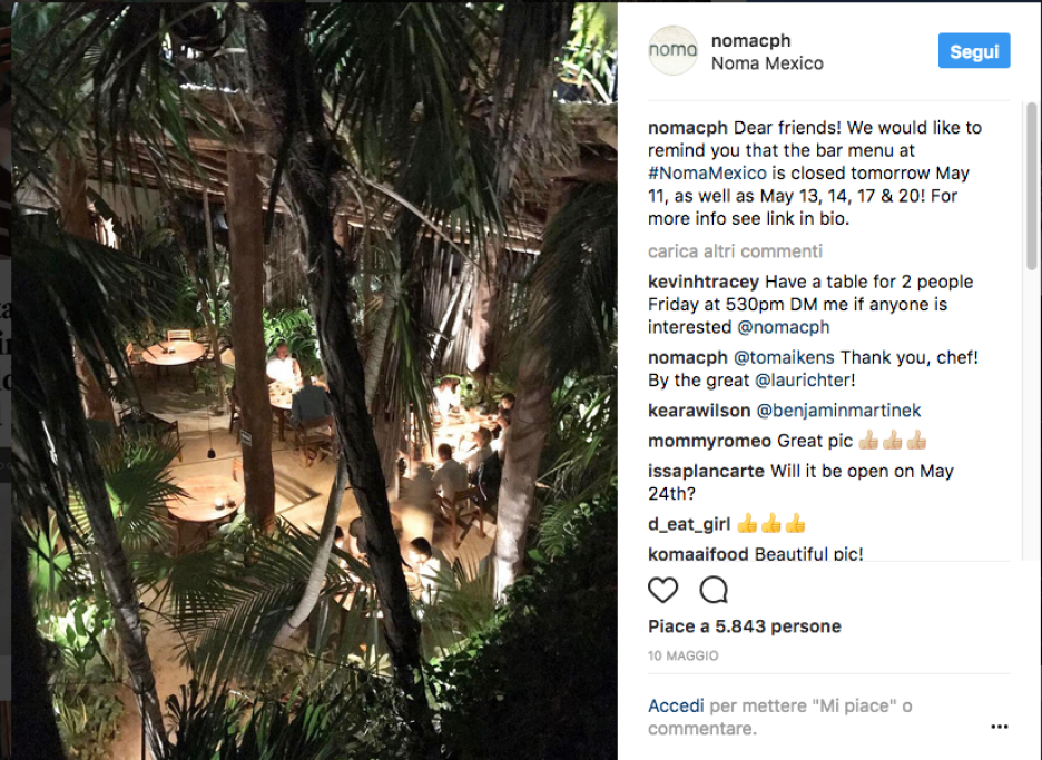 Le prenotazioni per un tavolo sono già aperte nel dicembre dello scorso anno (e nel corso di due ore tutti i posti sono esauriti), così, quando il ristorante ribattezzato Noma Tulum (o anche Noma Mexico) apre (solo per cena, dal mercoledì alla domenica), il 12 aprile, è impossibile trovare posto. Quando il ristorante chiude, il 28 maggio, l’incasso è di 4, 2 milioni di dollari.