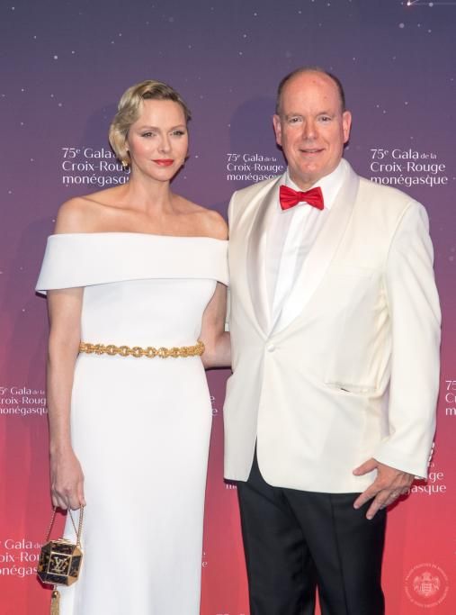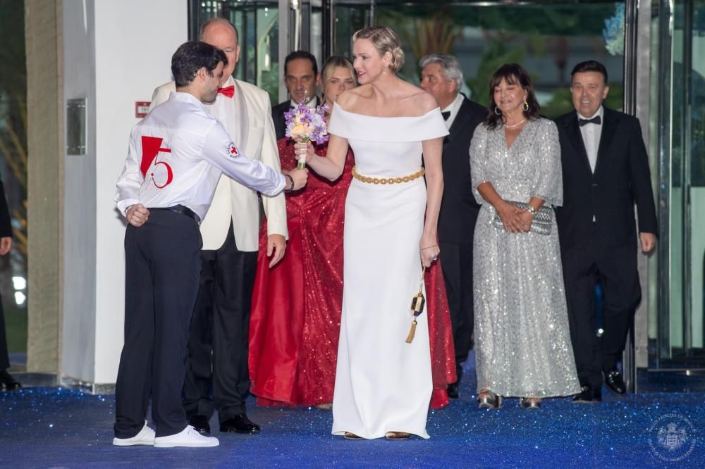 La Principessa di Monaco ha scelto di indossare uno splendido abito bianco a spalle scoperte di Louis Vuitton, con in vita una cintura dorata. Orecchini pendenti tempestati di pietre preziose firmati da Graff, in mano la borsetta modello minaudière, in metallo dorato, sempre di Louis Vuitton. Per il Principe Alberto, come consuetudine, smoking composto da giacca bianca e papillon rosso. Ad accompagnare la coppia principesca Camille Gottlieb, secondogenita della Principessa Stéphanie di Monaco, con un elegante e appariscente vestito rosso, una creazione della stilista kosovara Lia Stublla. Tra le celebrità e gli habitué non sono mancate Dame Shirley Bassey e la produttrice cinematografica Monika Bacardi con la figlia Maria Luisa.