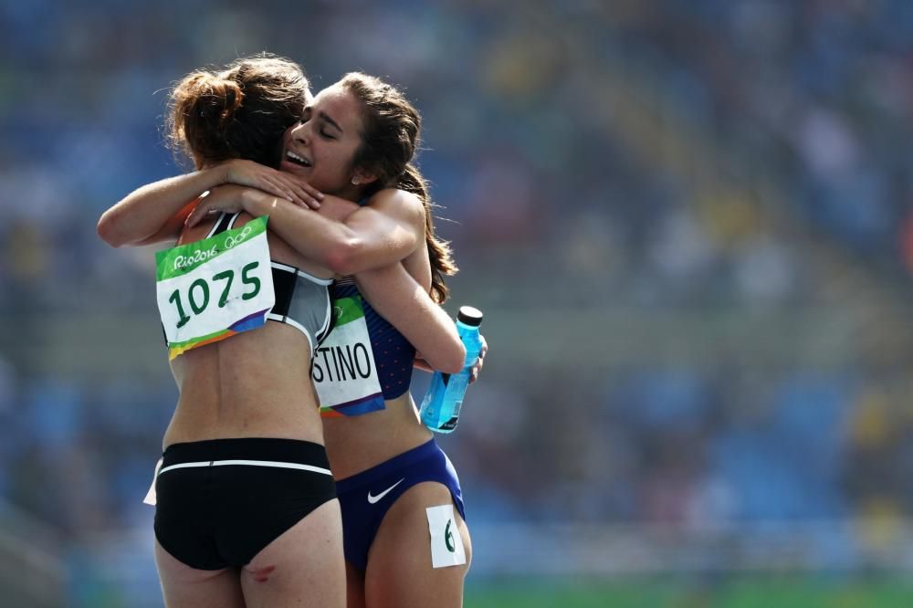 Entrambe doloranti e zoppicanti riprendono la corsa aspettandosi l’un l’altra. L’infortunio al ginocchio dell’americana è grave e lei ricade per due volte a terra. Questa volta è la Hamblin a soccorrere l’americana e a sorreggerla ed incitarla.