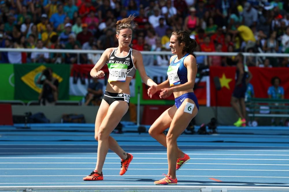 Nikki Hamblin atleta della Nuova Zelanda cade durante le manche dei 5.000m, dietro di lei l’americana Abbey D’Agostino nello stesso momento mette in fallo il piede e accusa una brutta torsione al ginocchio destro.