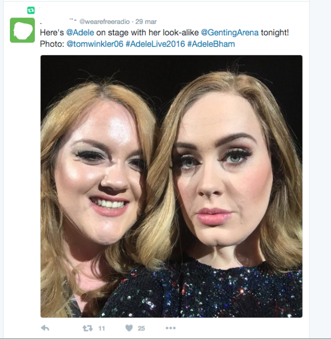 A raccontare l’accaduto è stato il fidanzato della ragazza, Emily Bamforth, che è riuscito ad attirare l’attenzione di Adele: «Ero seduto nelle prime file e sono riuscito ad attirare la sua attenzione anche perché sono piuttosto alto”. Del resto per la Bamforth non è una novità essere associata alla cantante, visto che in passato ha lavorato proprio come sosia di Adele e su Youtube ha realizzato una serie di video tutorial che spiegano come si fa a somigliare alla star.