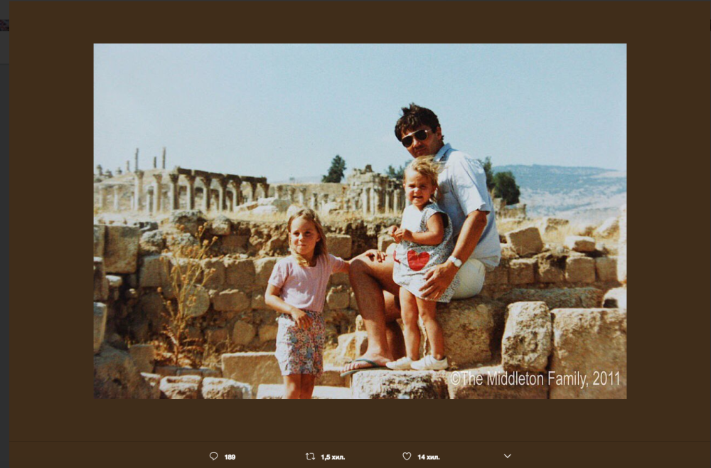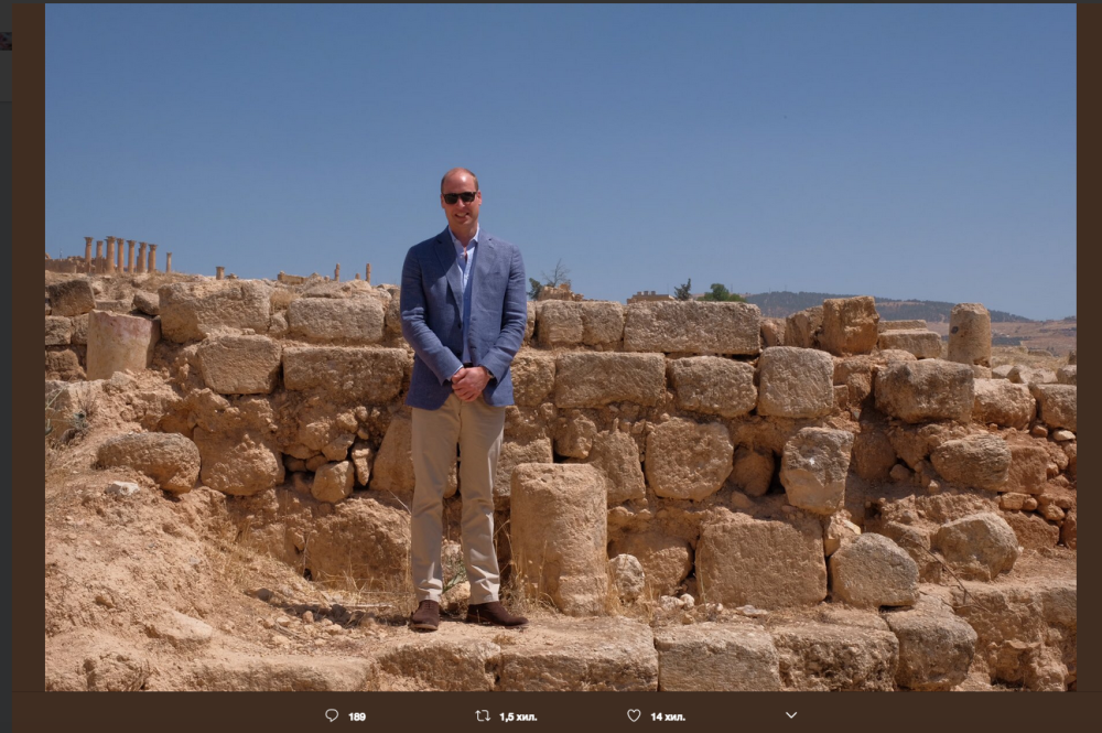 Sempre l’account Twitter di Kensington Palace ha pubblicato la foto del Principe William in visita a Jerash, sito archeologico della Giordania, dove anche la moglie Kate fu fotografata, All’epoca Kate aveva solo 4 anni, e si trovava in Giordania con la famiglia perché il papà, manager della British Airways, lavorava nel paese.