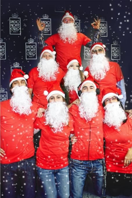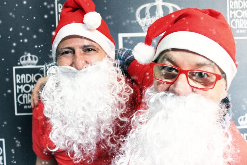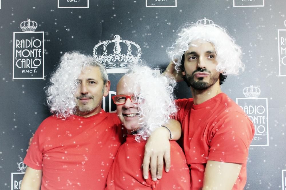 Il team del programma condotto da Massimo Valli e Marco Porticelli fotografato negli studi di RMC con tanto di barba bianca e cappellino rosso da Babbo Natale