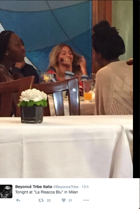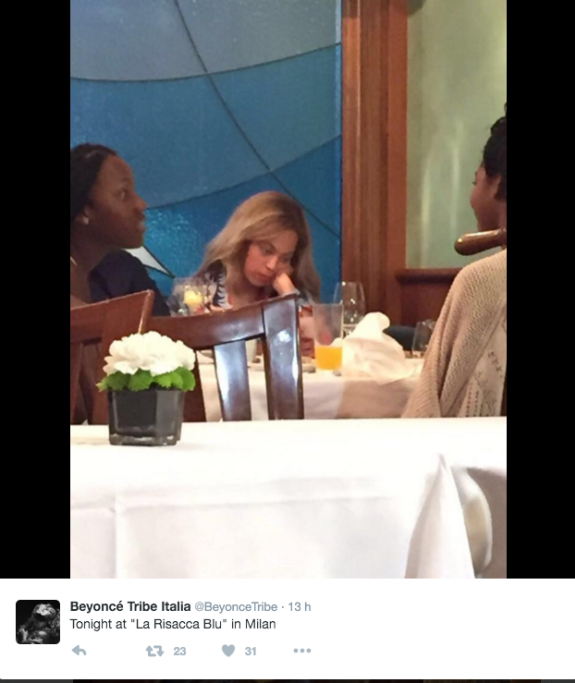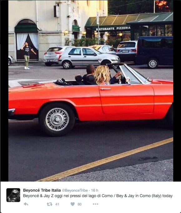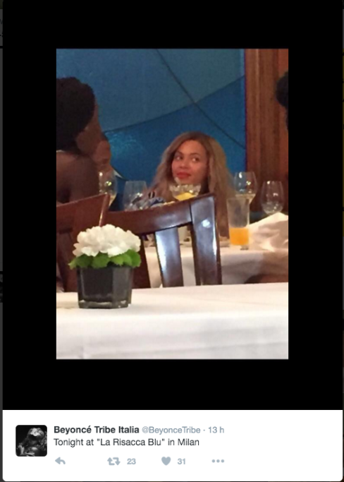 La star si esibisce live a Milano il 18 luglio, per un concerto tutto esaurito allo stadio San Siro. In questi giorni è stata avvistata in Lombardia, in un ristorante di Milano e in cabriolet rossa sul lago di Como (foto postate da Beyoncé Tribe Italia)