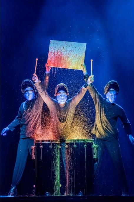 Ma com’è nata l’idea di questo trascinante megashow, all’insegna della pura gioia dei colori e del coinvolgimento multisensoriale? All’origine ci sono tre amici, Matt Goldman, Phil Stanton e Chris Wink, che nel 1991 danno vita al progetto Blue Man Group: tre artisti capaci di mixare in modo personale ed euforico arte, musica, teatro, poesia, divertimento, energia, tecnologia d’avanguardia e naturalmente tanto tanto colore. Il tutto presentandosi al pubblico con la pelle vistosamente tinta di blu e coinvolgendo gli spettatori in una performance ad alto tasso di felicità