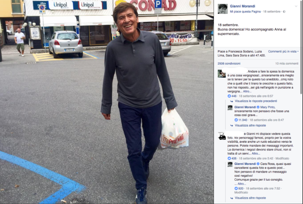 Gianni Morandi è nato a Monghidoro l’11 dicembre del 1944. Nel corso della sua lunga carriera, ha pubblicato 83 album, venduto oltre 50 milioni di copie dei suoi dischi, recitato al cinema e in televisione, condotto il Festival di Sanremo nel 2011 e 2012, corso dieci maratone (tra cui due volte quella di New York). E’ commendatore della Repubblica Italiana ed è molto attivo sui social media. Nella nostra gallery infatti vi facciamo vedere la foto del suo perfetto “mannequin challenge” e l’immagine che aveva scatenato una lunga discussione sul web, in cui l’artista era ritratto al supermercato la domenica.