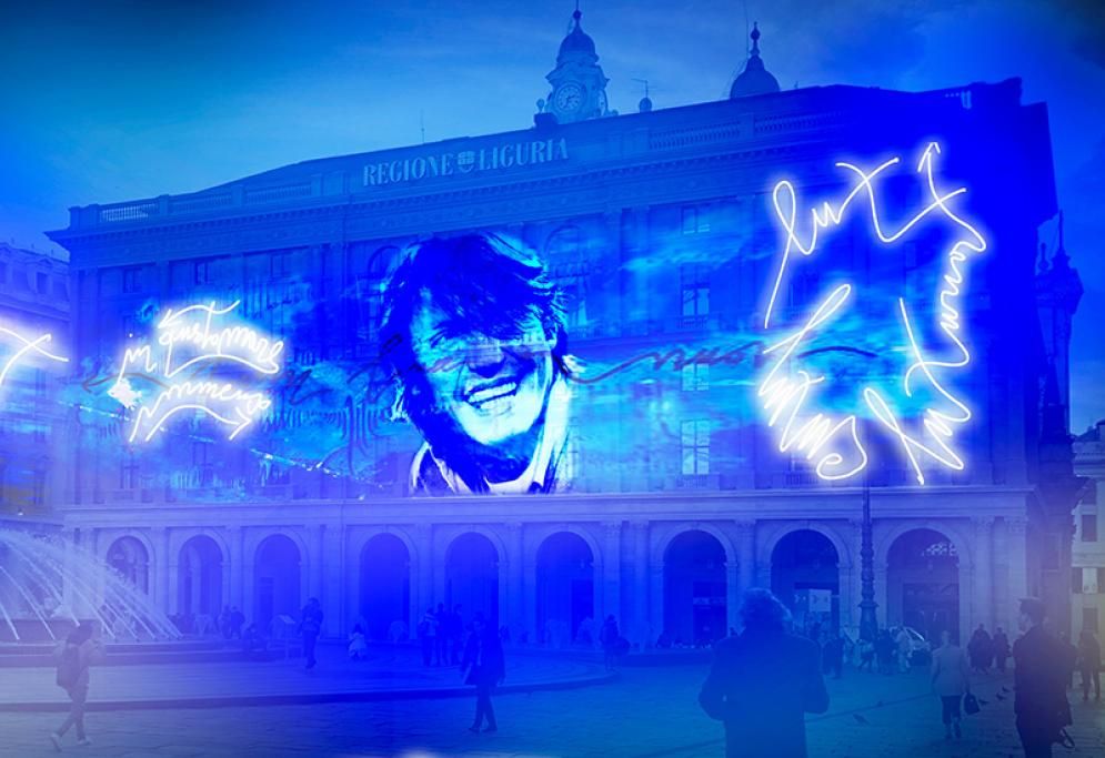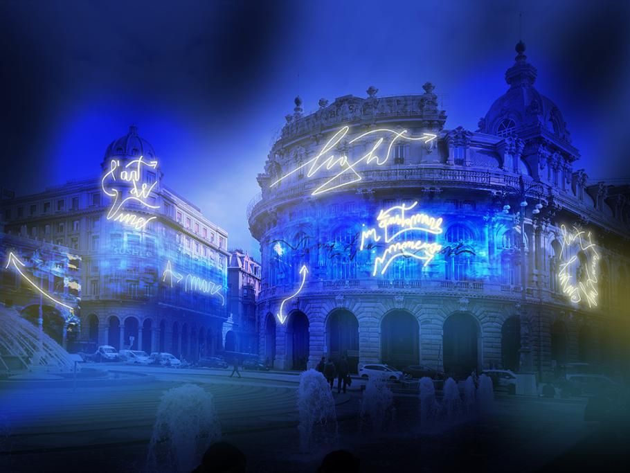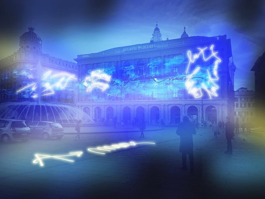 Piazza de Ferrari diventa così un palcoscenico a cielo aperto: sui palazzi si proiettano parole danzanti, opera dei più amati poeti genovesi, Sanguineti, Montale, Caproni.