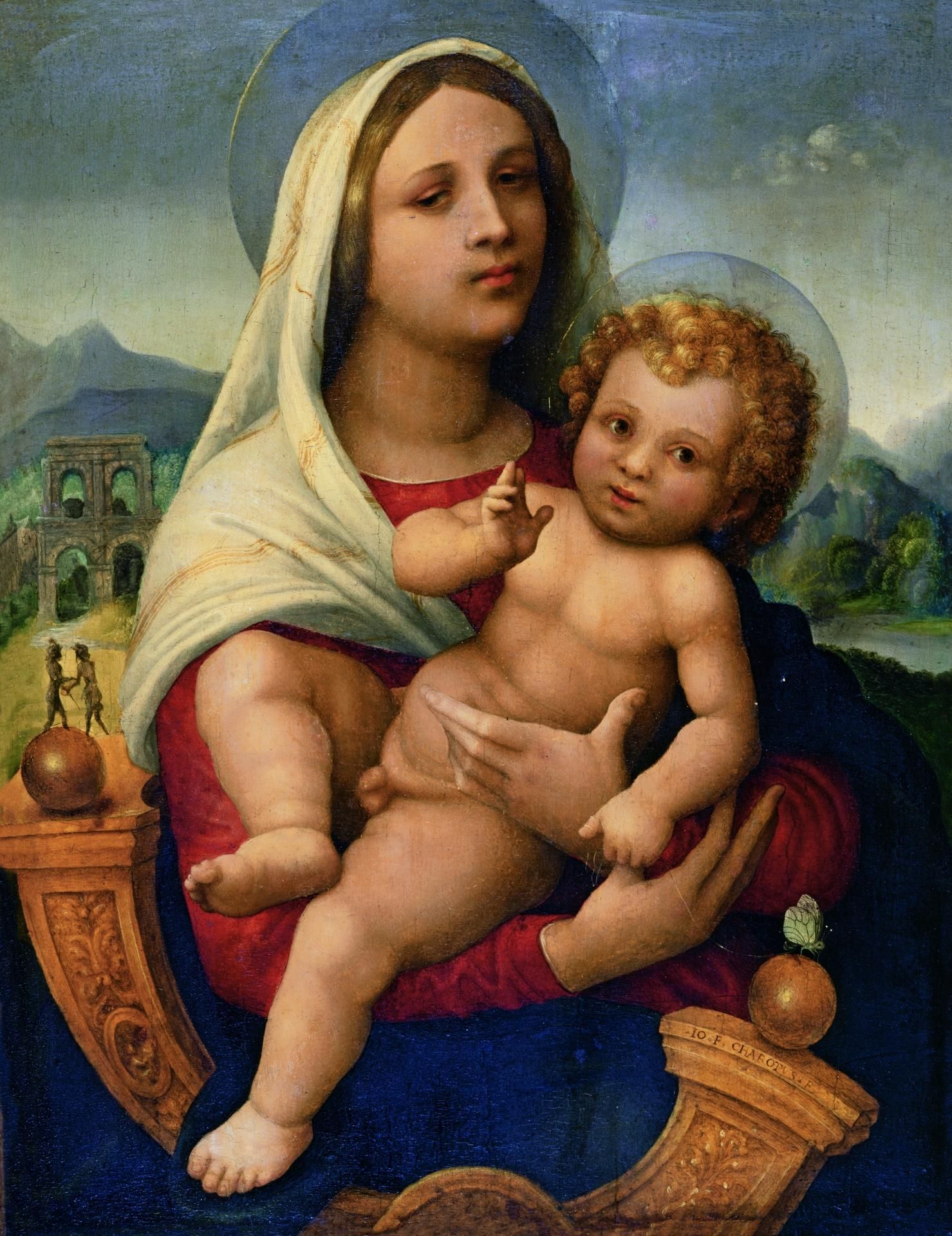 Giovan Francesco Caroto visse a Mantova, alla corte dei Gonzaga, sotto l’egida di Mantegna; a Milano , al servizio di Antonio Maria Visconti; a Casale Monferrato, alla corte del marchese Guglielmo IX Paleologo. Conobbe e apprezzò la pittura fiamminga e nordica e anche Raffaello e i suoi seguaci, si dedicò a pittura, miniatura, disegno naturalistico, medaglistica, statuaria, ma raggiunse forse i suoi esiti più personali e felici nel ritratto e e nella pittura di paesaggio.