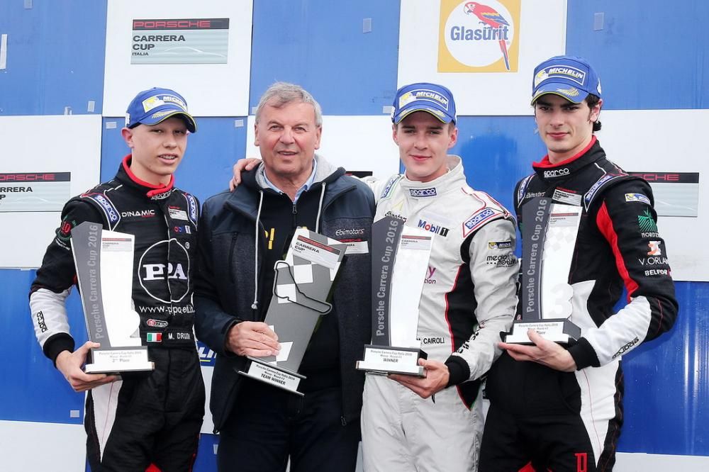 Esordio a Monza nel nuovo format per l’emozionante torneo 2016 della Carrera Cup Italia. A trionfare è stato Matteo Cairoli (Ebimotors – Centro Porsche Como), che ha centrato il successo in Gara 1, 2 e 3, nonostante l’ultima corsa sia stata resa ancora più difficile dall’asfalto bagnato per la pioggia. Secondo posto per Mattia Drudi (Dinamic Motorsport – Centro Porsche Modena). Terzo Alessio Rovera (Ebimotors – Centro Porsche Verona), un altro giovane dello Scholarship Programme.