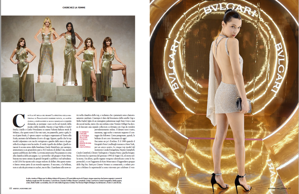 Facciamo un po’ d’ordine. È il 1989 quando il fotografo Peter Lindbergh riunisce a New York, per un unico scatto, le cinque top model del momento: Linda Evangelista, Naomi Campbell, Cindy Crawford, Christy Turlington e Tatjana Patitz. Quella fotografia diventa la copertina del gennaio 1990 di Vogue Uk, ed entra nella storia. Da allora, quelle ragazze vengono identificate come le Supermodel, e con l’aggiunta di Kate Moss nasce il leggendario gruppo delle Big Six. Sarà poi Gianni Versace a consacrarle, e infatti proprio a Milano le supermodel si sono ritrovate per celebrare il ventennale della scomparsa dello stilista, indossando abiti dorati per il gran finale del défilé disegnato dalla sorella Donatella. Le supermodel di allora, delle quali faceva parte anche la futura première dame Carla Bruni, sono ancora nei cuori di molti.