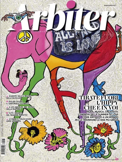 Sai cosa? Tu sei lì e fai l’artista. Con i tuoi colori, le tue idee, il tuo vino, i tuoi muri e le tue notti. È tutto lì. Poi accade qualcosa. Incontri il direttore di Arbiter, Franz Botré, nel suo ufficio stracolmo di quadri, riviste, penne, Whisky, storie, coraggio. Con aria severa, ma con lo sguardo divertito, ti dice: «Il prossimo numero del giornale racconterà il periodo… degli hippy, e lei farà la copertina!». Con aria divertita, ma con lo sguardo altrettanto severo, penso: «Oh c…o!», e rispondo deciso come un capitano di ventura: «Sì, volentieri!».
