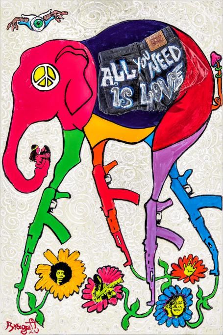 Turn on, turn in, drop out. La forma della proboscide diventa metafora della carnalità sessuale, una libertà incondizionata di vivere l’altro. Una metafora della carnalità, che in quel periodo, è presente anche tra Uomo e Natura. Un universo dove sentirsi «libero di vivere e amare in un modo che la maggior parte della gente a malapena si azzarda a sognare». L’elefante non è solo. Un occhio alato lo accompagna, lo sorveglia. Tributo al grafico Rick Griffin, genio artistico dei poster psichedelici. Ho sacrificato le vere ali di Griffin per dare all’occhio, al mio occhio, le ali della musica: delle Fender Stratocaster che come ali sembrano sollevare tutto, e sotto par di sentire Hendrix suonare le note di Hey Joe. Un periodo, quello degli hippy, short. Short come jeans Levi’s sbattuti nel quadro, nascosti nell’elefante. Simbolo. Grido. Oggi moda. Ieri modus vivendi. Sai cosa? Come dice il filosofo, «per inventare la macchina perfetta non è necessario sapere come farla». Questo periodo, quello degli hippy, è riuscito a fare qualcosa senza sapere come, e come tutti i periodi, tutte le epoche, come tutti gli elefanti che si rispettino, si muovono sempre dentro un delizioso negozio di cristalli. All you need is love.