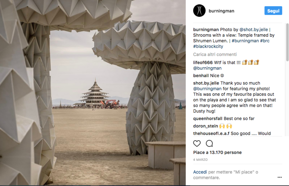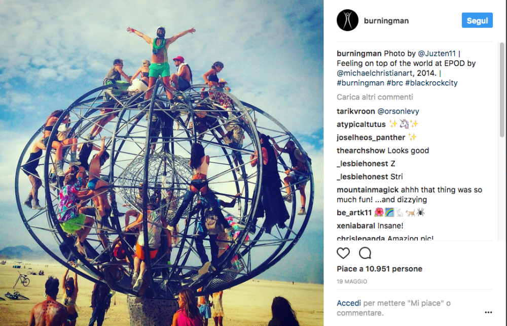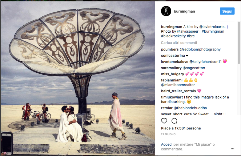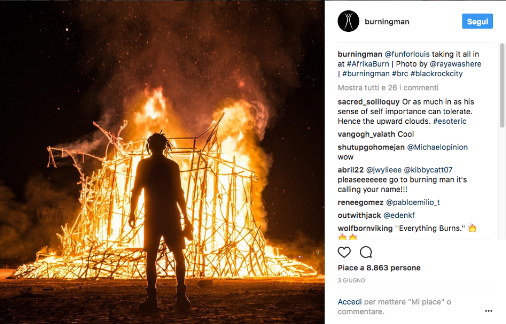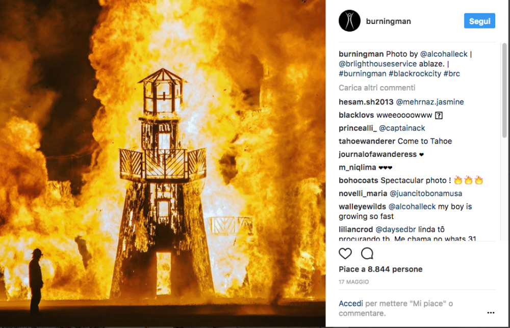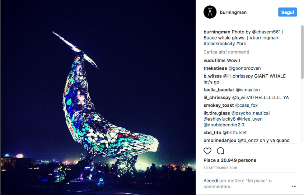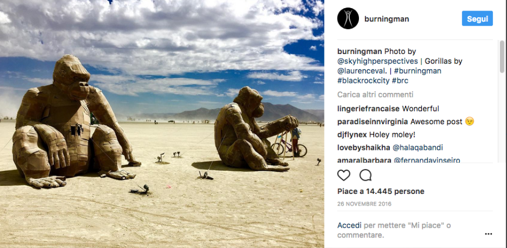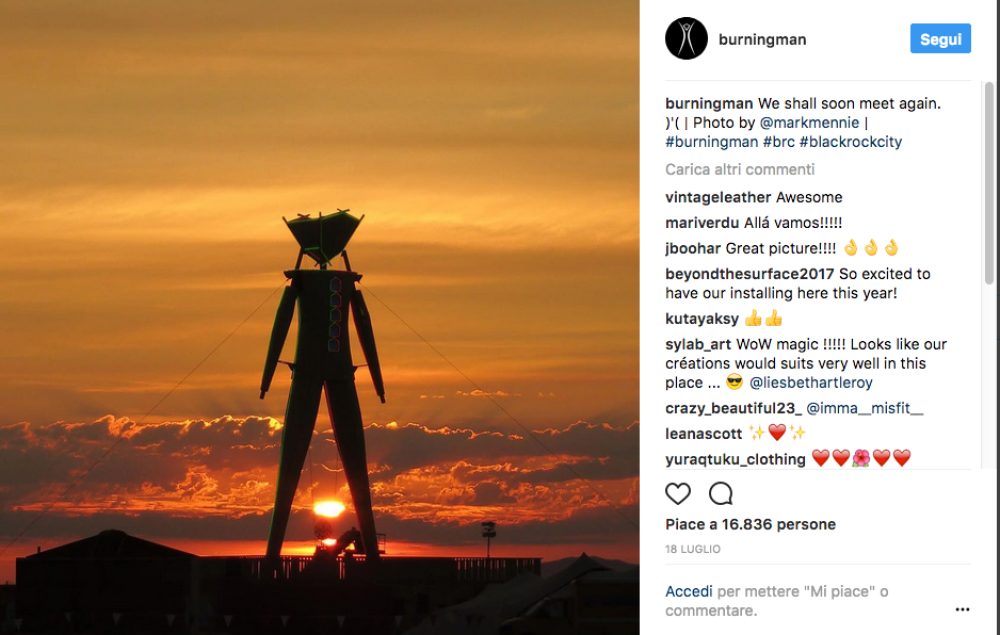 Era il 1991 quando un gruppo di amici diede vita al Burning Man, un festival di performance artistiche libere, nel deserto del Nevada. Chiamato Burning Man dal rito finale dell’happening, che vede il rogo di un enorme fantoccio, si svolge ormai ogni anno con un successo sempre maggiore. Per otto giorni Black Rock City, una città che esiste solo per la durata del Burning Man, nel Deserto Black Rock in Nevada, si popola di artisti, performer, curiosi. Ciascuno porta con sé la propria attrezzatura da campeggio, cibo e acqua, perché al Burning Man sono in vendita solo ghiaccio e caffè e tutto il resto si baratta. Il Burning Man 2017 si è concluso il 4 settembre. Ecco alcune delle foto più spettacolari.