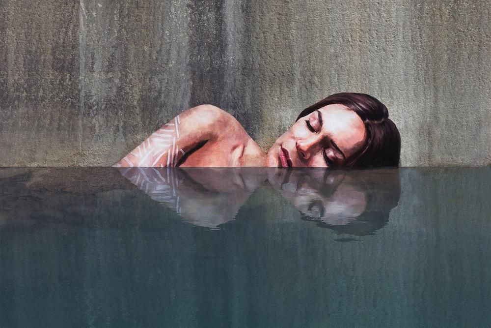 Sean Yoro, in arte Hula, dipinge sull’acqua. Non intesa come superficie su cui stendere il colore, ma come punto d’appoggio per raggiungere spazi dove nessun altro è arrivato. I suoi murales, incredibilmente realistici, raffigurano una donna che affiora dal mare, come se stesse nuotando.
