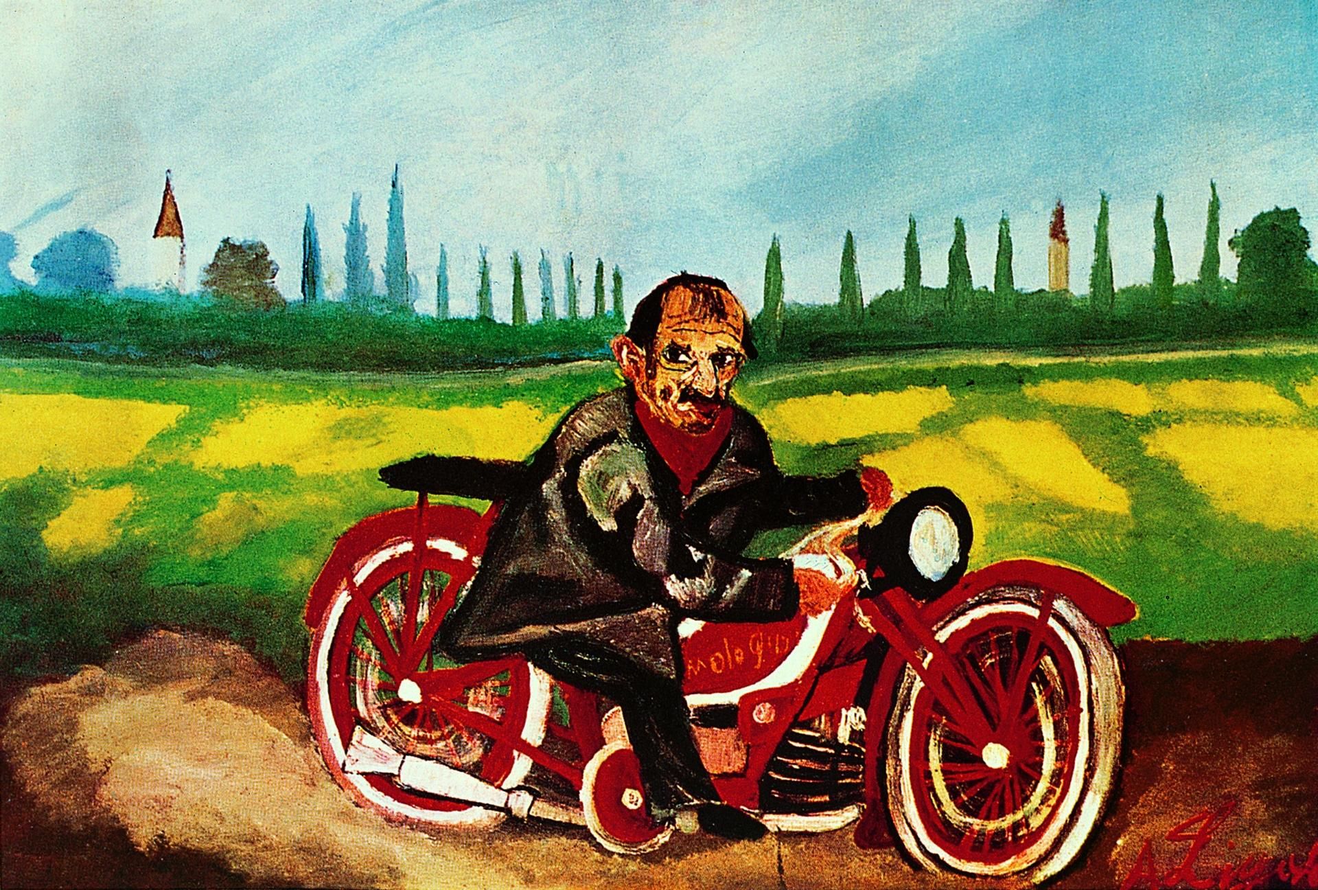 La moto racchiude un universo fatto di evasione dalla routine, stile, esaltazione del viaggio, anche interiore. E coinvolge filosofia e letteratura (come dimenticare il celebre libro di Pirsig “Lo Zen e l’arte della manutenzione della motocicletta“?). Anche l’arte è stata investita dal suo messaggio. E la mostra della Venaria fa dialogare oltre cinquanta modelli di moto  con opere d’arte contemporanea, in modo espliciti o indiretto. Tra i nomi degli artisti esposti, Antonio Ligabue con l’Autoritratto sulla moto, Mario Merz con Ac-celerazione=sogno, Pino Pascali con 9mq di pozzanghere, Alighiero Boetti con Rosso Guzzi e Rosso Gilera, Giuliano Vangi con Vejo. Autentica chicca sono i dipinti di Paul Simonon, ex bassista dei Clash, appassionato collezionista di moto.