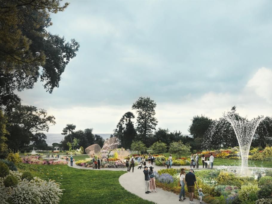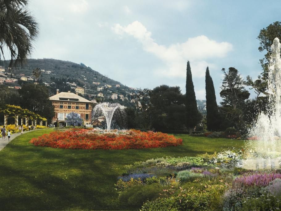 Grandi sequenze di ruscelli e fontane, ampi spazi ovali si combineranno con le suggestive visuali dei Parchi per offrire ai visitatori prospettive emozionanti con essenze rare, esemplari unici, collezioni straordinarie e produzioni di eccellenza sviluppate su 86mila metri quadrati e un sistema di percorsi ampliato che attraversa giardini e ville storiche affacciati sul mare. Il progetto è arricchito dalla presenza dell’acqua. All’interno di ogni spazio ellittico è infatti collocato un sistema di vasche circolari collegate da assi di ruscellamento; le vasche sono caratterizzate dalla presenza di getti d’acqua, in alcuni casi concentrici, in altri verticali, in altri ancora come combinazione dei due tipi. La geometria semplice delle vasche, l’integrazione con il disegno delle ellissi e la reiterazione nei tre parchi fa sì che l’acqua costituisca una nuova dimensione estetica che segna in modo omogeneo l’esperienza del pubblico di Euroflora, un accompagnamento costante della visita alla mostra, dal punto di vista visivo ma anche dal punto di vista acustico, con lo scrosciare dei ruscelli.