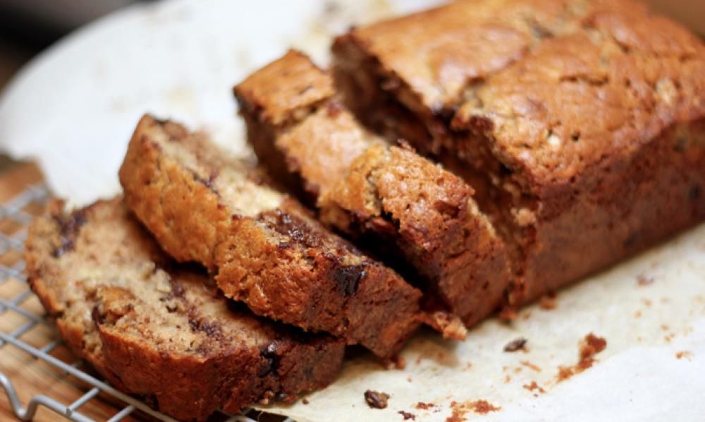 Occorrono: 1 tazza di zucchero di canna, 100 grammi di burro, 1 tazza e mezza di banane schiacciate, 2 uova, 2 cucchiaini da tè di estratto di vaniglia, 2 tazze di farina, 1 cucchiaino e mezzo da tè di bicarbonato, sale, mezza tazza di chip al cioccolato, 1 cucchiaino da tè di lievito. Come si prepara: amalgamate il burro e lo zucchero, unite poi le banane schiacciate, le uova e la vaniglia. Aggiungete al mix tutti gli altri ingredienti. Imburrate e infarinate una teglia e versatevi il composto, copritelo con un foglio d’alluminio. Fate cuocere per 30 minuti a 325°, rimuovete il foglio d’alluminio e continuate a cuocere per altri 30 minuti.