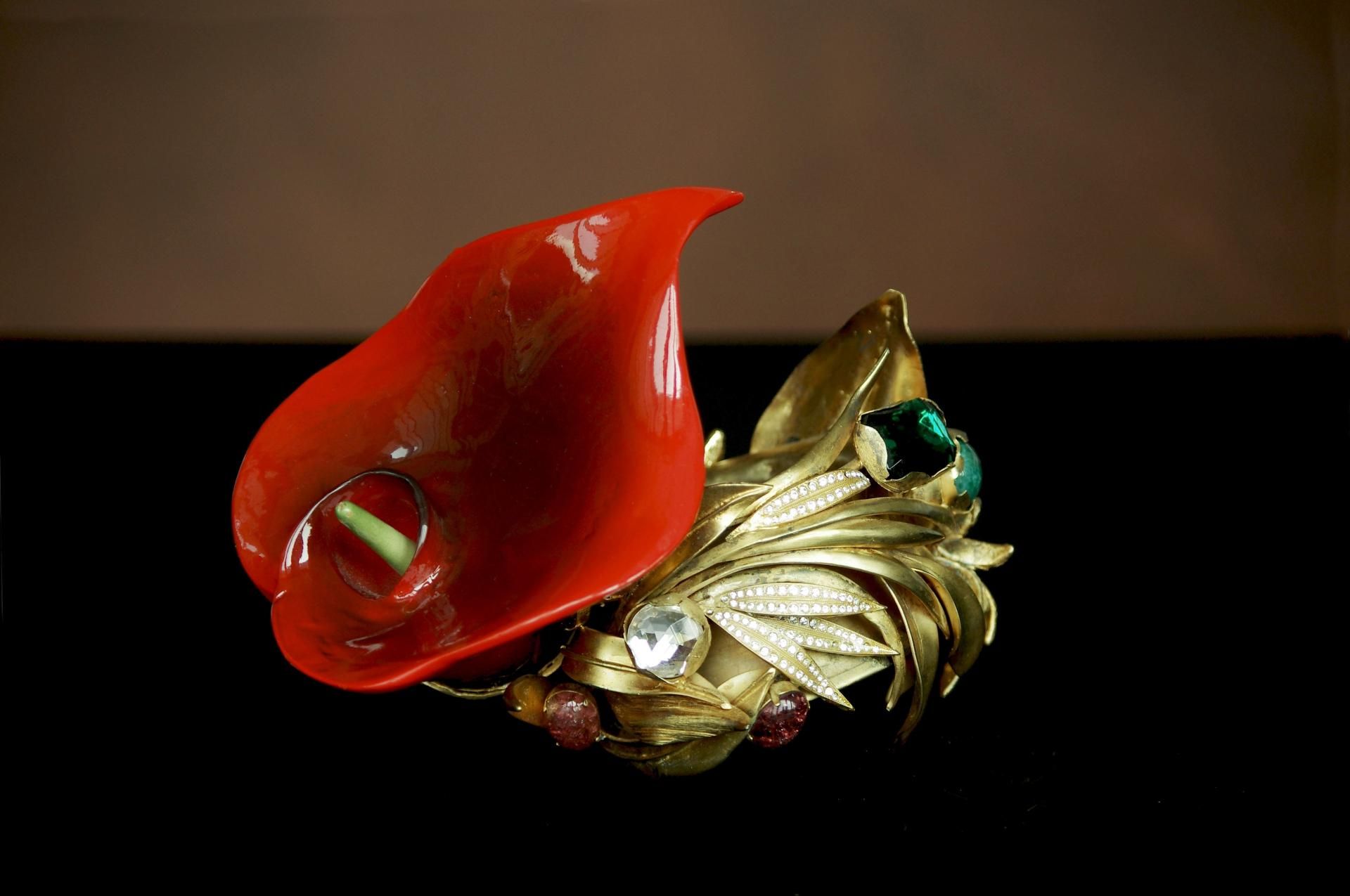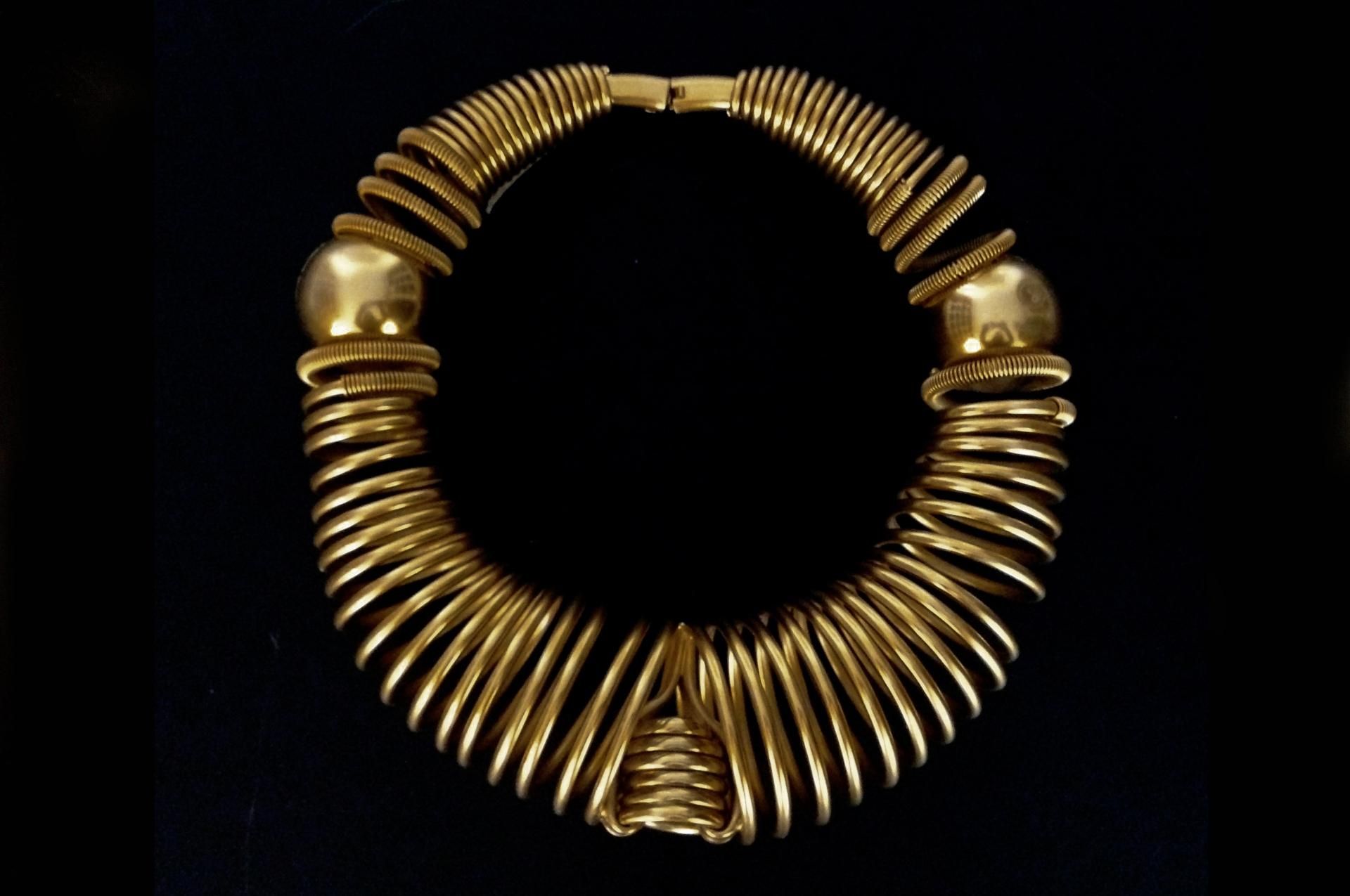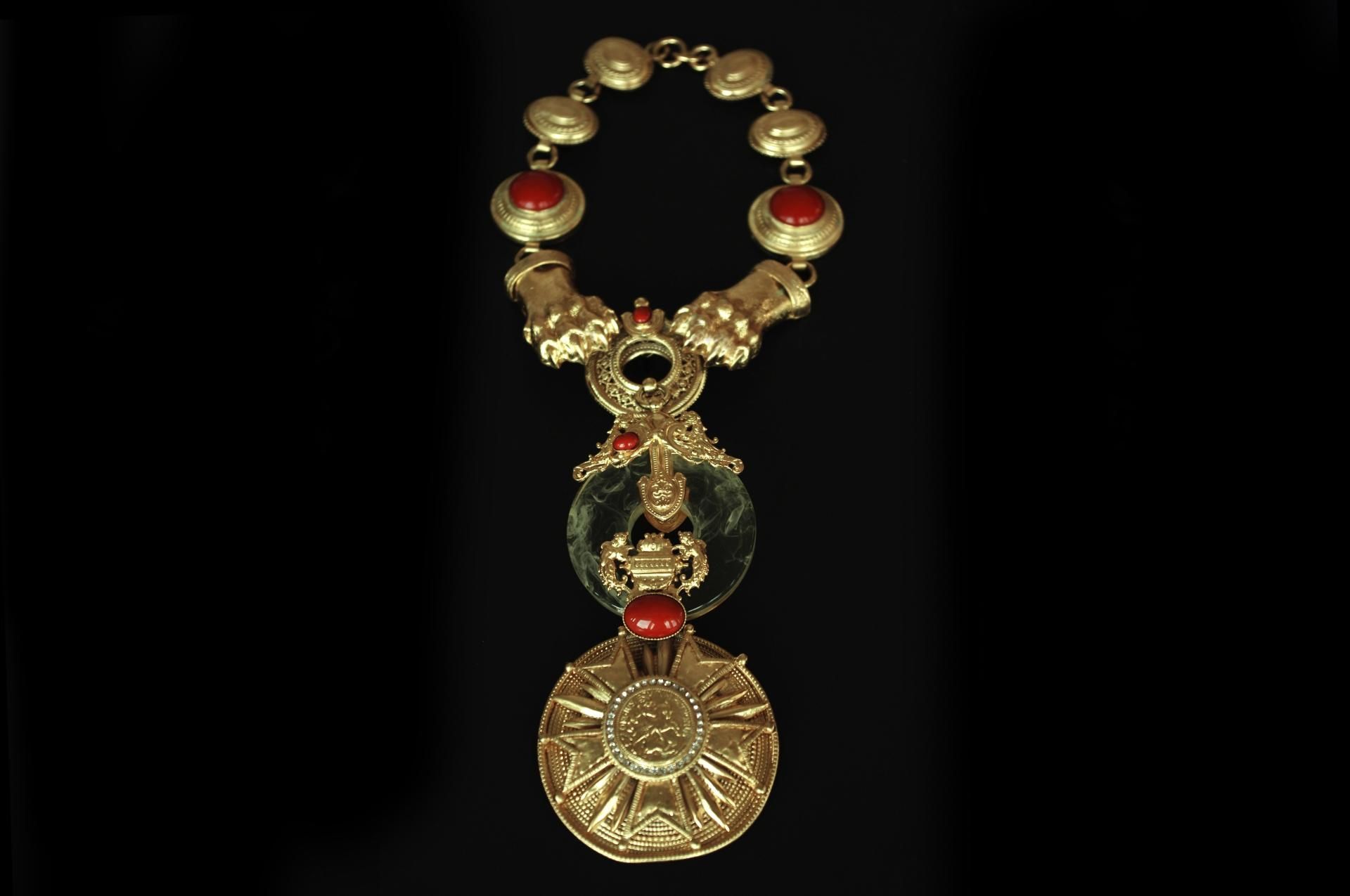 Gioielli e ornamenti non erano mai semplici accessori per il geniale stilista, che era attratto dal lavoro sui materiali e riservava loro un approccio appassionato e innovativo. In mostra oggetti realizzati per le sfilate dal 1980 al 2007, tra complementi degli abiti e capi in cui è la materia-gioiello a dettare forma e sostanza dell’outfit. La curatrice della mostra, Francesca Alfano Miglietti, ricorda come Ferré costruisca «una zona franca all’interno di un proprio mondo di riferimento, elaborando ogni oggetto sulla scia di un sistema di classificazione generale di concetti che diventano oggetti. E così pietre lucenti, metalli smaltati, conchiglie levigate, legni dipinti, vetri di Murano, ceramiche retrò, cristalli Swarovski, e ancora legno e cuoio e ferro e rame e bronzo, nel susseguirsi di un incantato orizzonte di spille, collane, cinture, anelli, bracciali, monili. Per Ferré l’ornamento non è il figlio minore di un prezioso, ma un concetto di eternità che deve rappresentare l’immanenza del presente».