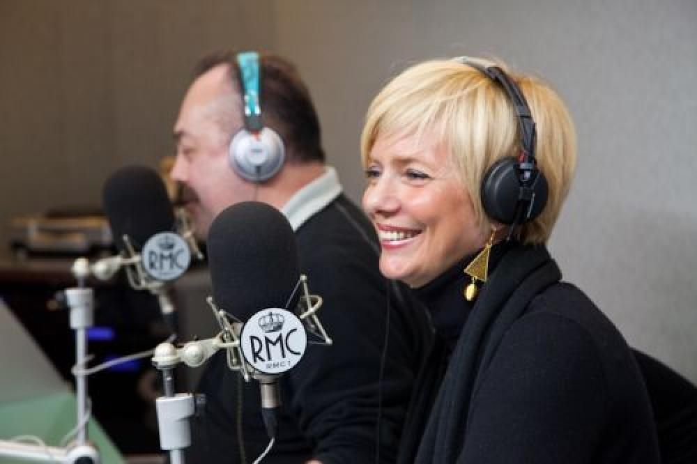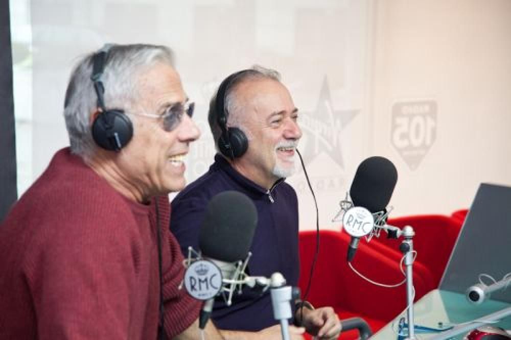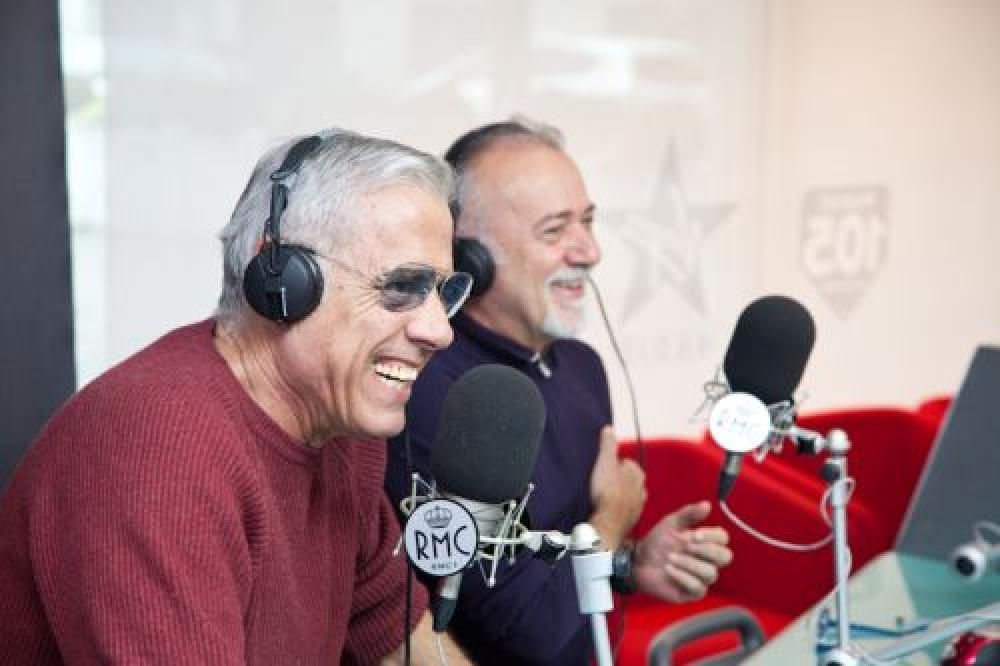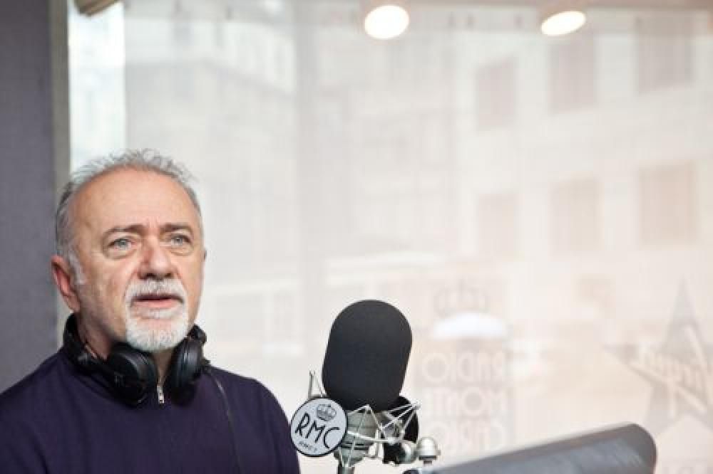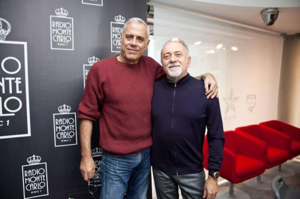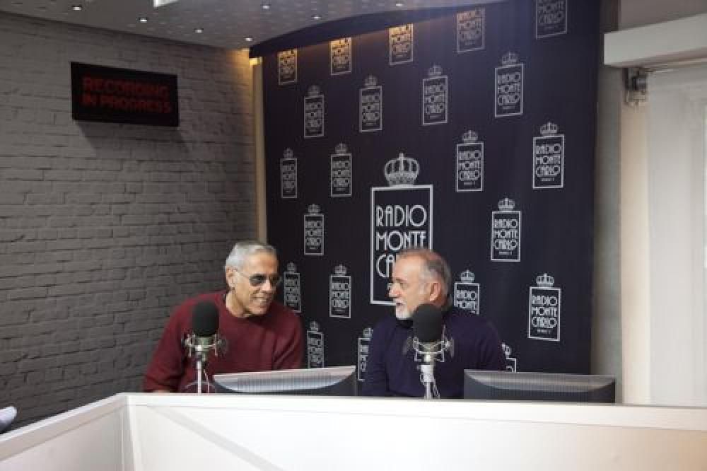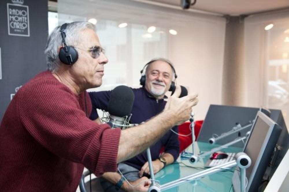 Lo scrittore Giorgio Faletti ospite negli studi di Radio Monte Carlo, durante RMC In Tempo Reale, con Teo Teocoli, Monica Sala e Max Venegoni