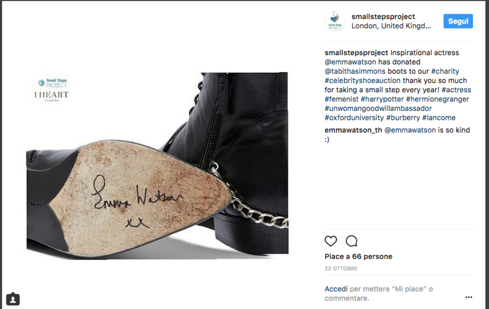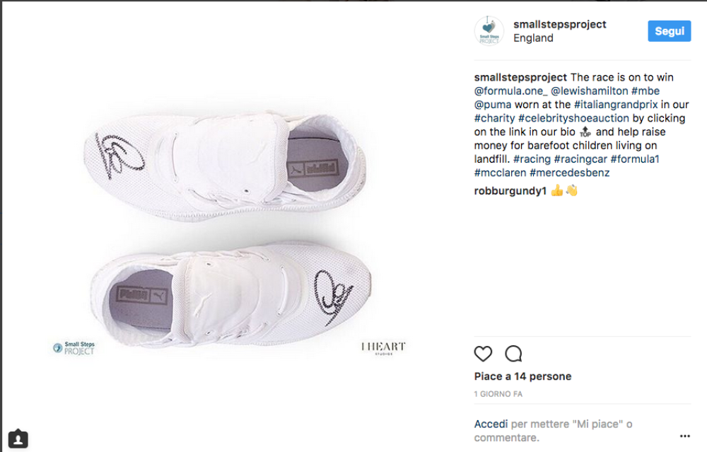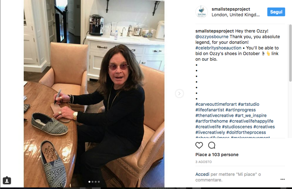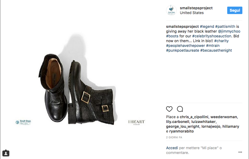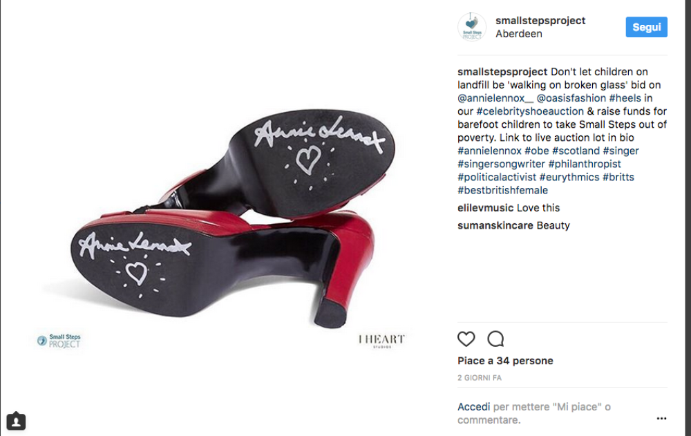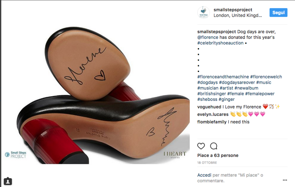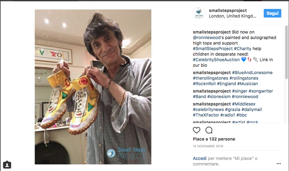 Stavolta è proprio il caso di dirlo: gli artisti… ti fanno le scarpe! O meglio, mettono all’asta alcune delle loro calzature, debitamente autografate, e naturalmente a fin di bene. Il denaro ricavato dalla vendita andrà infatti all’associazione britannica The Small Steps Project, che aiuta gli adulti a trovare lavoro e i bambini a ricevere un’adeguata educazione.