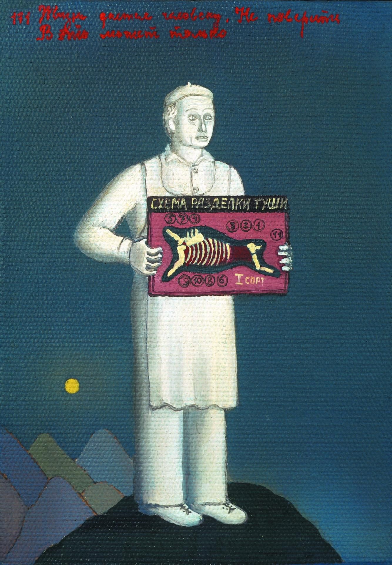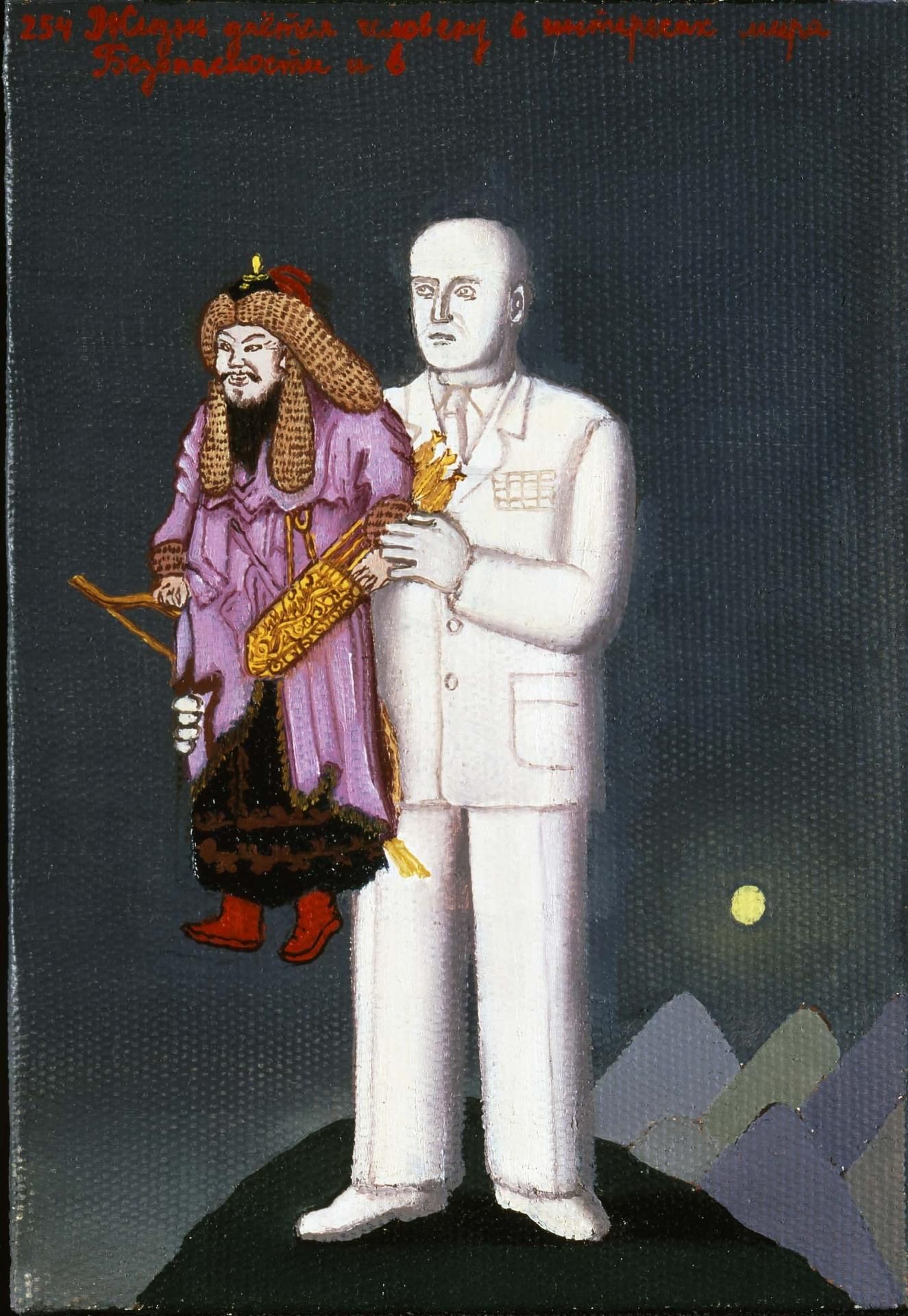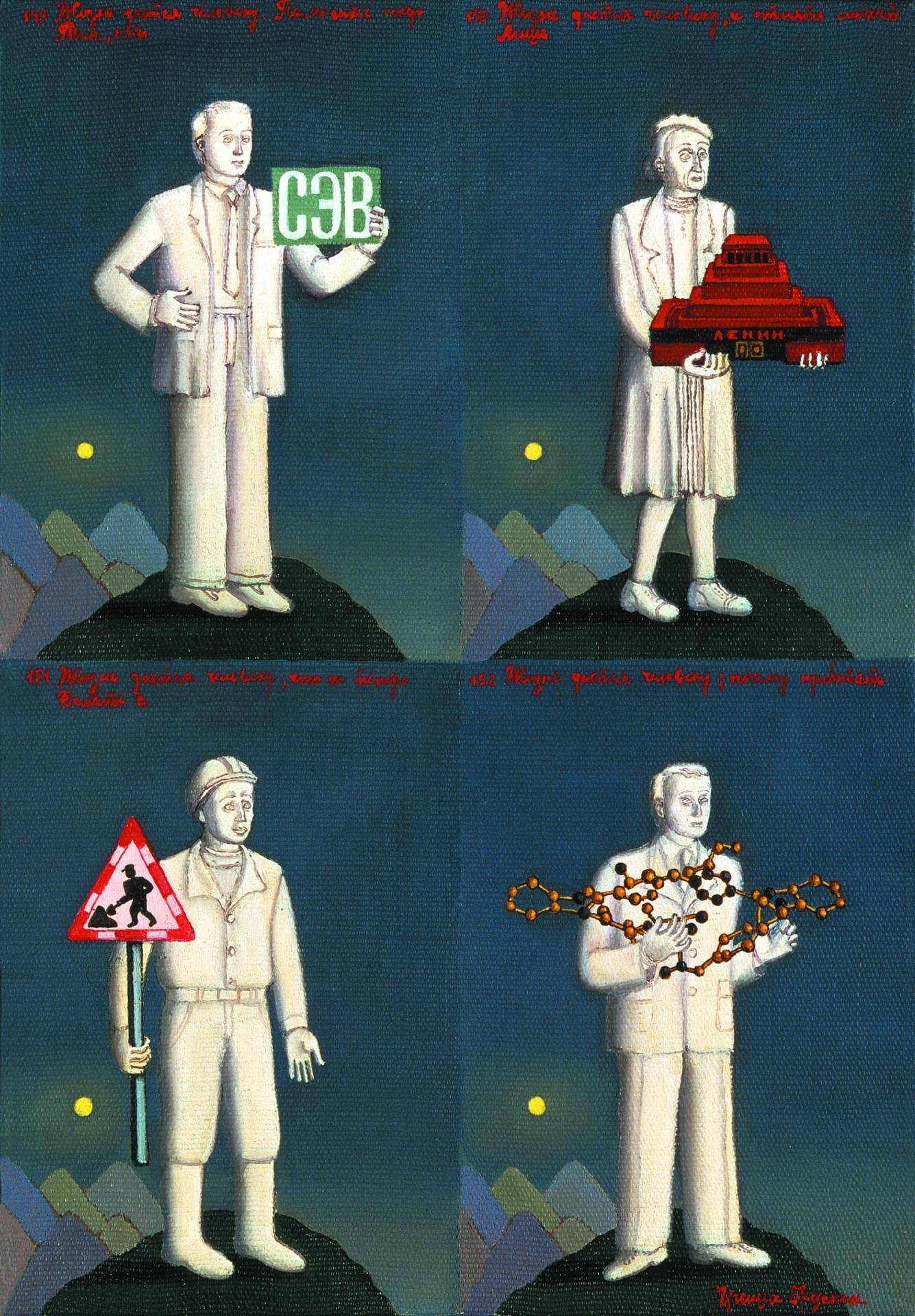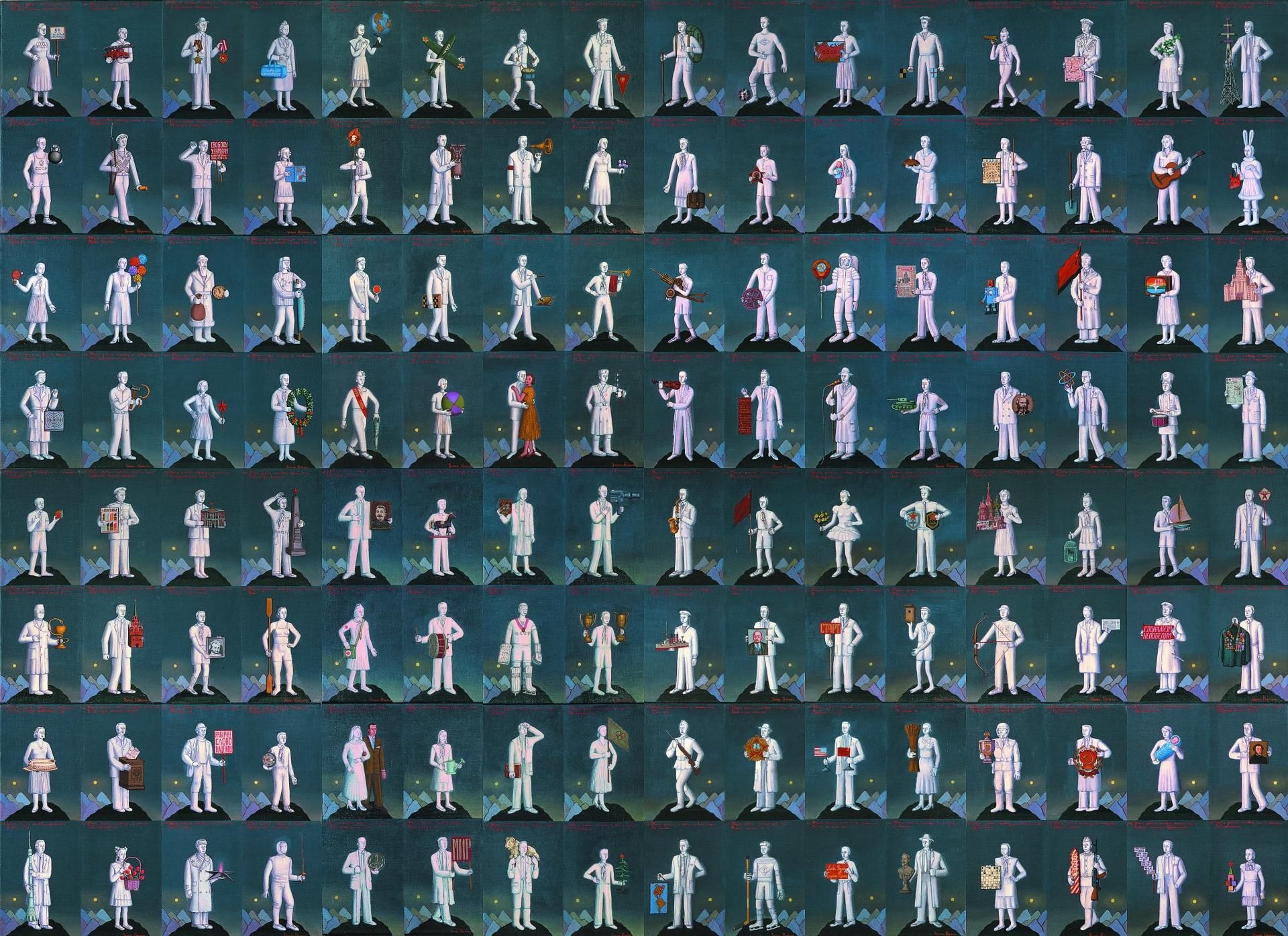 A comporre l’opera, due pannelli a olio su tela, ciascuno con 128 personaggi che rappresentano gli archetipi dell’ideologia sovietica: il pioniere, l’operaio, il soldato ecc. Volti identici ed espressione vuota delle figure volevano dare il senso della vita quotidiana sotto un regime. La mostra presenta anche 24 disegni preparatori, 25 statuette in porcellana (1998-1999) e 49 sculture in bronzo realizzate dall’artista nel triennio 2001-2003.