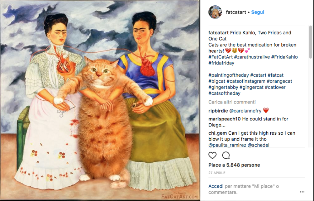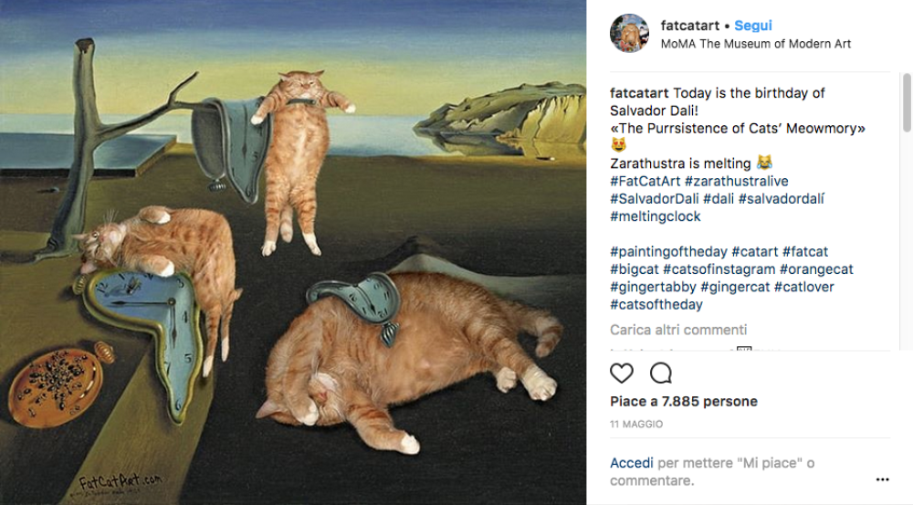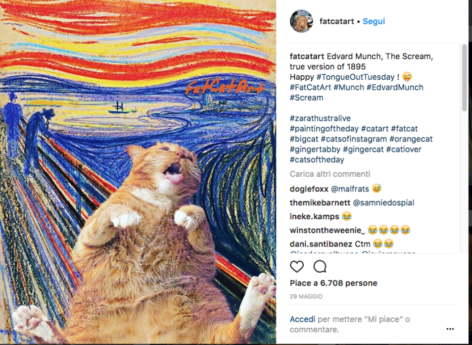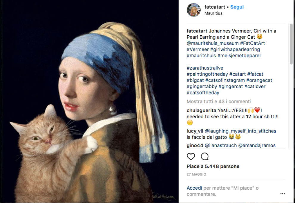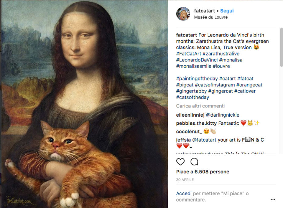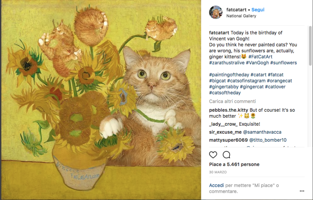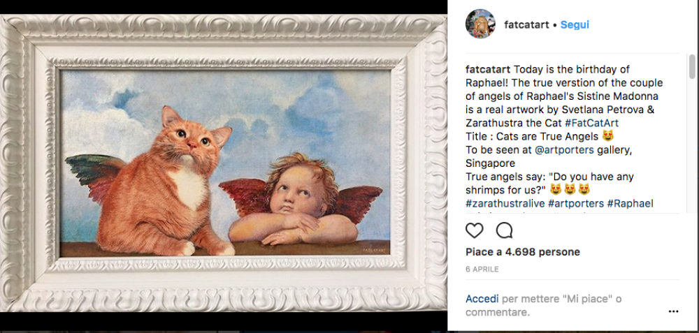 Un grosso gatto rosso appare beato nei quadri più celebri della storia. Ma… perché? Perché si tratta del progetto battezzato Fat Cat Art, con cui l’artista Svetlana Petrova rilegge le grandi opere pittoriche, grazie all’aiuto del suo gatto Zarathustra.