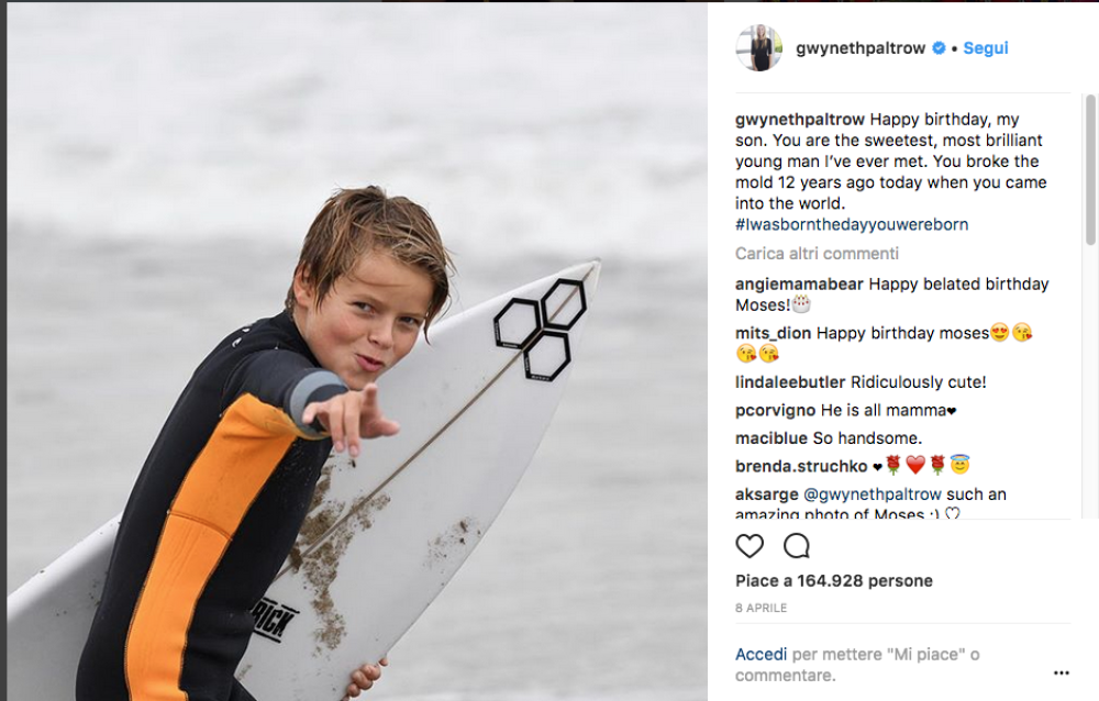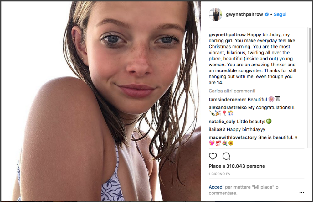 Gwyneth ha formulato auguri commoventi alla figlia, che la fa sentire «come se ogni giorno fosse Natale» ed è «la più vibrante, spiritosa, volteggiante, bellissima (dentro e fuori) giovane donna, dalle sorprendenti riflessioni e dall’incredibile talento di compositrice». E conclude: «grazie per passare il tuo tempo ancora con me, anche se ormai hai 14 anni». Poco tempo fa Gwyneth aveva festeggiato con una foto sui social anche il secondogenito Moses.