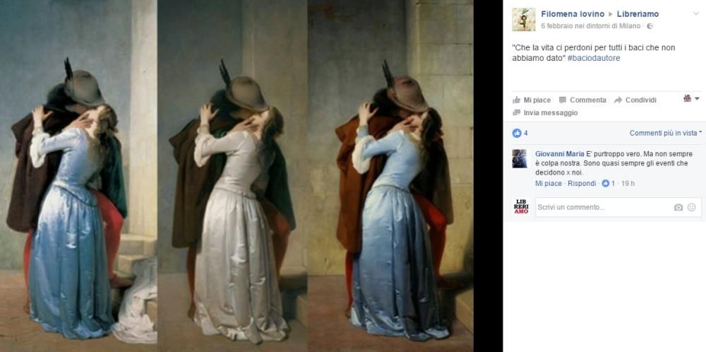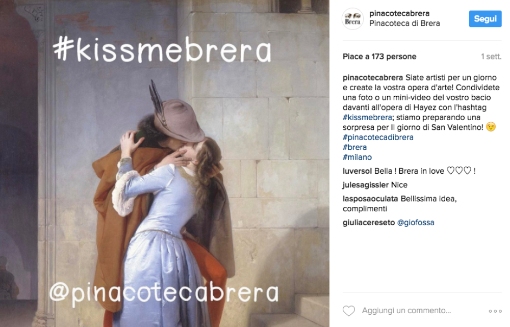 La Pinacoteca di Brera ha lanciato l’iniziativa #kissmebrera e ha invitato i visitatori a essere artisti per un giorno, ricreando la loro opera d’arte personale e condividendo su Instagram una foto o un video che immortali un bacio davanti al quadro “Il bacio” del pittore italiano Francesco Hayez con l’hashtag #kissmebrera. Sempre online sta spopolando la campagna social “Bacio d’autore”, ideata da Libreriamo, che invita gli utenti a scegliere il loro bacio preferito per poi condividerlo sulle pagine Facebook, Twitter ed Instagram del portale, accompagnato da un aforisma romantico. “Con questa campagna vogliamo rendere protagonisti tutte le persone romantiche che nutrono una grande passione per la cultura e per i libri“, ha affermato Saro Trovato, sociologo e fondatore di Libreriamo. Momento clou della campagna su Twitter sarà il 13 febbraio prossimo, giorno in cui verrà rilanciato l’hashtag #BaciodAutore per farlo entrare nei Trend Topic italiani della piattaforma. Dunque, una serie di iniziative che vivono online per celebrare l’amore per la cultura in occasione di San Valentino. Con questa gallery vi diamo solo un piccolo assaggio di tutto ciò.