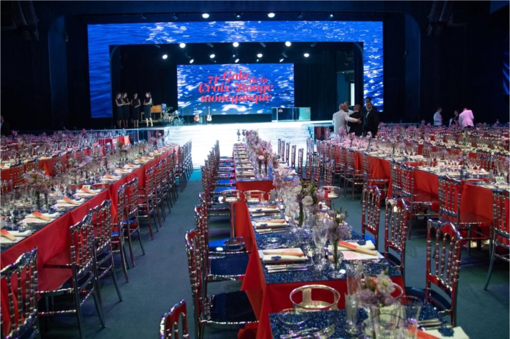 Allo Sporting Monte Carlo va in scena la 71° edizione del Gala della Croce Rossa Monegasca. Un’onda di fiori dai toni blu e azzurro accoglie i partecipanti nella hall. Il tema di quest’anno è il mare, il suo movimento che porta il messaggio di preservarne i fondali.