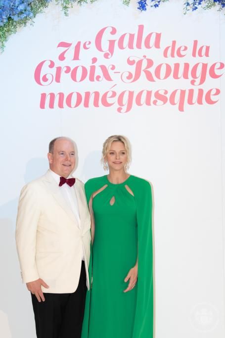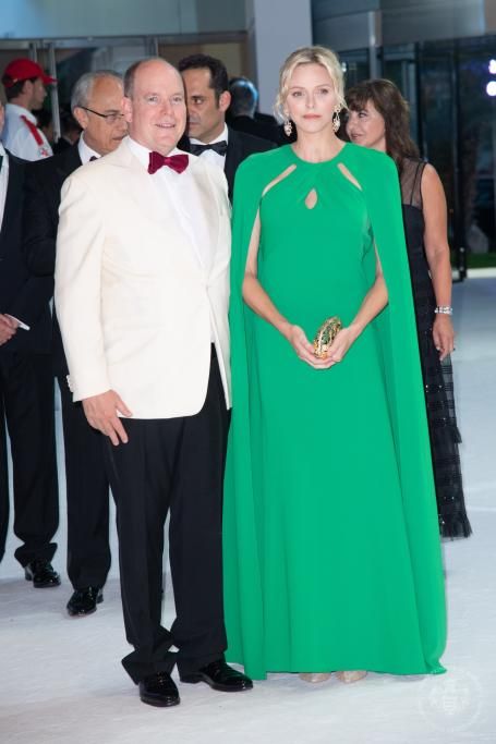 E come sempre giacca bianca anche per il Principe Alberto II, che insieme alla moglie, la Principessa Charlene, fasciata da un abito verde acceso, fanno il loro ingresso da veri padroni di casa.