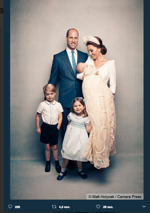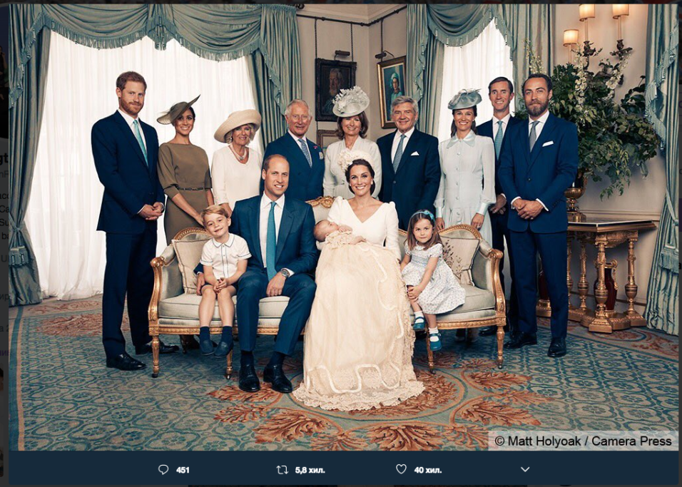 La Famiglia Reale ha reso pubbliche le foto ufficiali del battesimo del Principino Louis. Come ormai è consuetudine, Kensington Palace, residenza dei giovani Principi William e Harry e delle loro mogli, Kate e Meghan, ha diffuso sui suoi social gli scatti di famiglia dedicati al battesimo. Grande foto di gruppo dunque per il Principino Louis, circondato da mamma Kate e papà Wiliam, dal nonno paterno (il Principe Carlo, con Camilla), dai nonni materni (i signori Middleton), dagli zii Meghan ed Harry, dalla zia Pippa col marito e dallo zio James Middleton. Non mancano naturalmente gli altri royal baby, i suoi fratellini. E indovinate chi come sempre conquista l’obbiettivo dei fotografi? Ma la piccola Charlotte, senza dubbio!