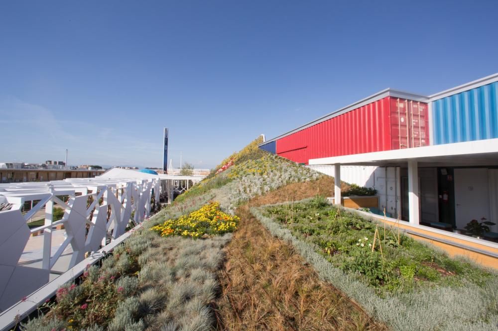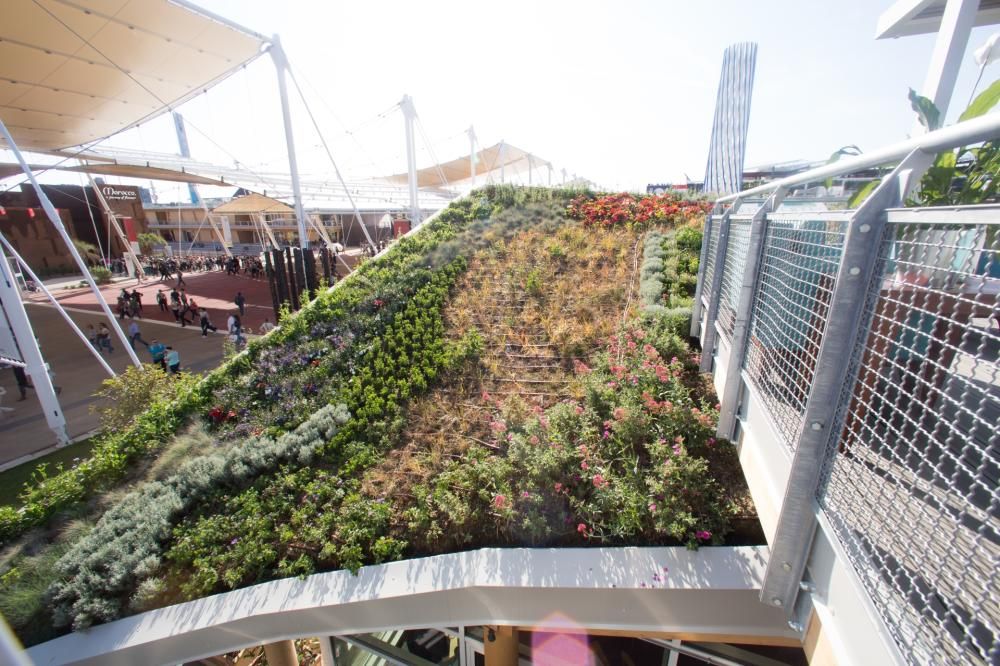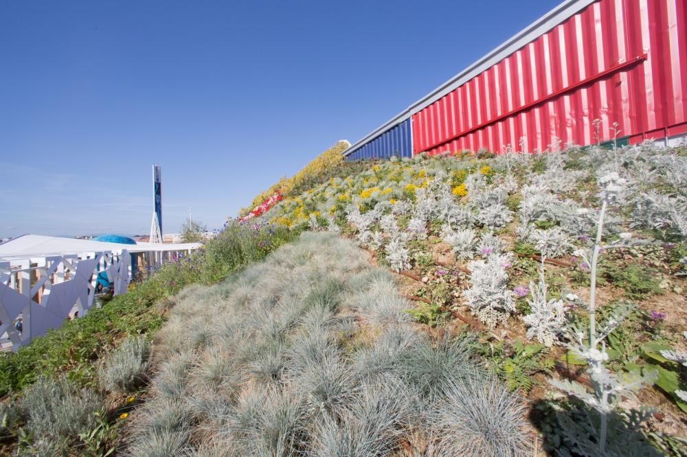 Ispirato al tema di Expo, “Nutrire il pianeta”, il roof garden ospita, nella sua zona orizzontale, coltivazioni commestibili tipiche dell’area del Mediterraneo e alcune piante esotiche, come l’hibiscus, il cui frutto, l’Okra, è utilizzato come cibo dalle popolazioni africane. Il roof garden è diviso in nove sezioni, con due tipi di vegetazione: piante perenni ad alto fusto e piante perenni basse e da bordura. Ogni gruppo è costituito da tre specie differenti, in modo da assicurare una fioritura costante durante tutto il periodo dell’Expo. Diversi isolotti sono poi dedicati a rappresentare la vegetazione tipica dei cinque continenti presenti all’Expo.