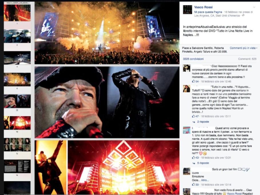 Vasco Rossi prepara la sua ultima pubblicazione. Domenica 21 febbraio il rocker di Zocca ha pubblicato sulla sua pagina Facebook le prime foto “in anteprima abusiva esclusiva” tratte dal libretto che accompagna il dvd “Tutto in una Notte – Live in Naples“, girato allo Stadio San Paolo lo scorso 3 luglio. Nel post anche alcune immagini che compariranno nel booklet del cofanetto che dovrebbe comprendere due cd ed il dvd live del concerto, un lavoro interamente dedicato alla memoria di Pino Daniele. Il dvd contiene non solo le immagini live dalla notte dello scorso 3 luglio, ma anche riprese del backstage e la pubblicazione è in programma per il mese di marzo, anche se non c’è ancora una data ufficiale.