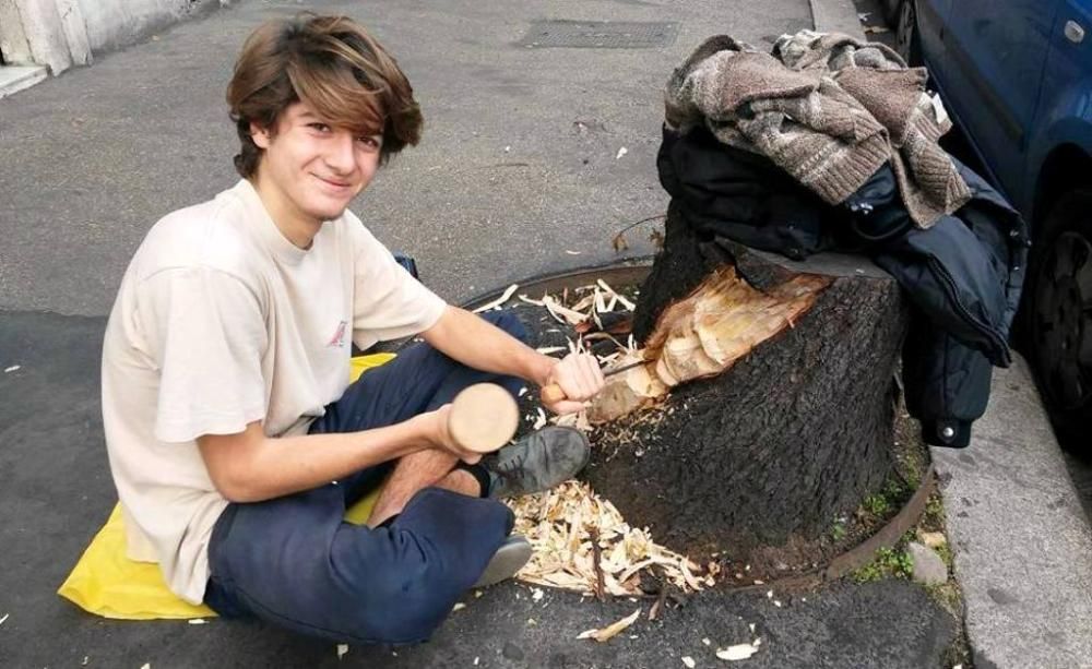 La sua idea nasce da una passione per l’arte che lo porta a girare per la città con uno zaino in spalla e tutti i suoi attrezzi: scalpellino e mazzuolo.