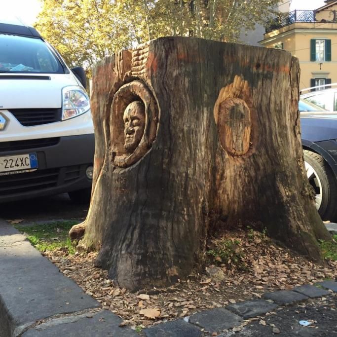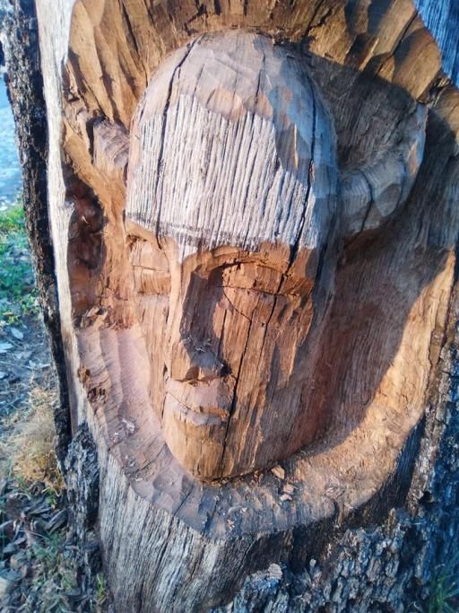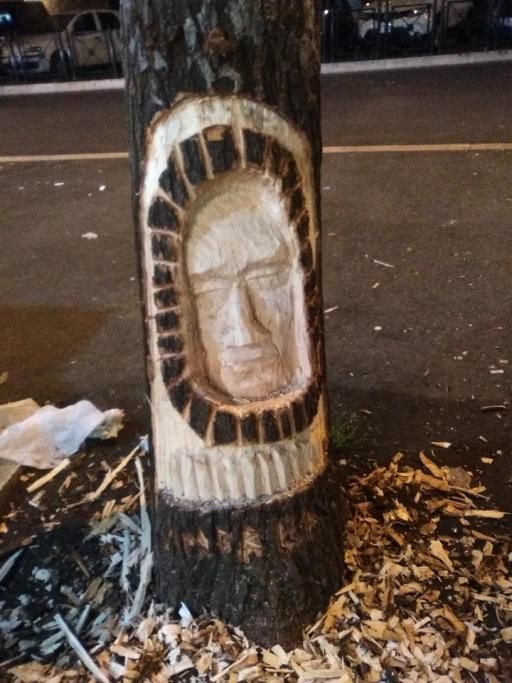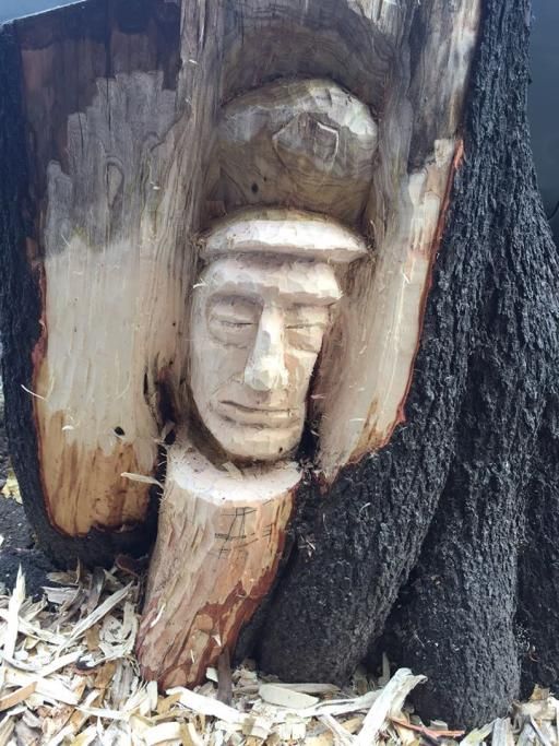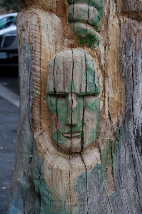 Dopo aver ripulito i torsi senza vita degli alberi, incide dei volti, mettendo in evidenza i colori e le venature di quelli che, un tempo, erano platani.