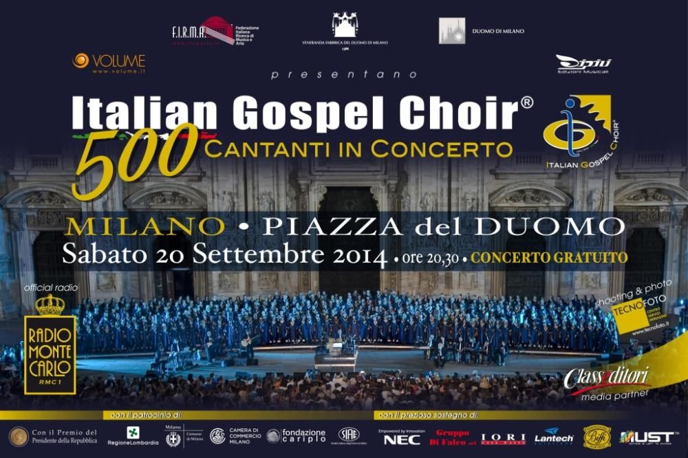 Appuntamento sabato 20 settembre alle ore 20.30, in Piazza del Duomo a Milano per una serata eccezionale e dal grande impatto emozionale grazie al concerto dell’Italian Gospel Choir (il coro che rappresenta l’Italia in questo genere musicale)Sul sagrato della maestosa cattedrale si schiereranno 500 coristi provenienti da tutto il Paese. A introdurre la serata, Nick the Nightfly.